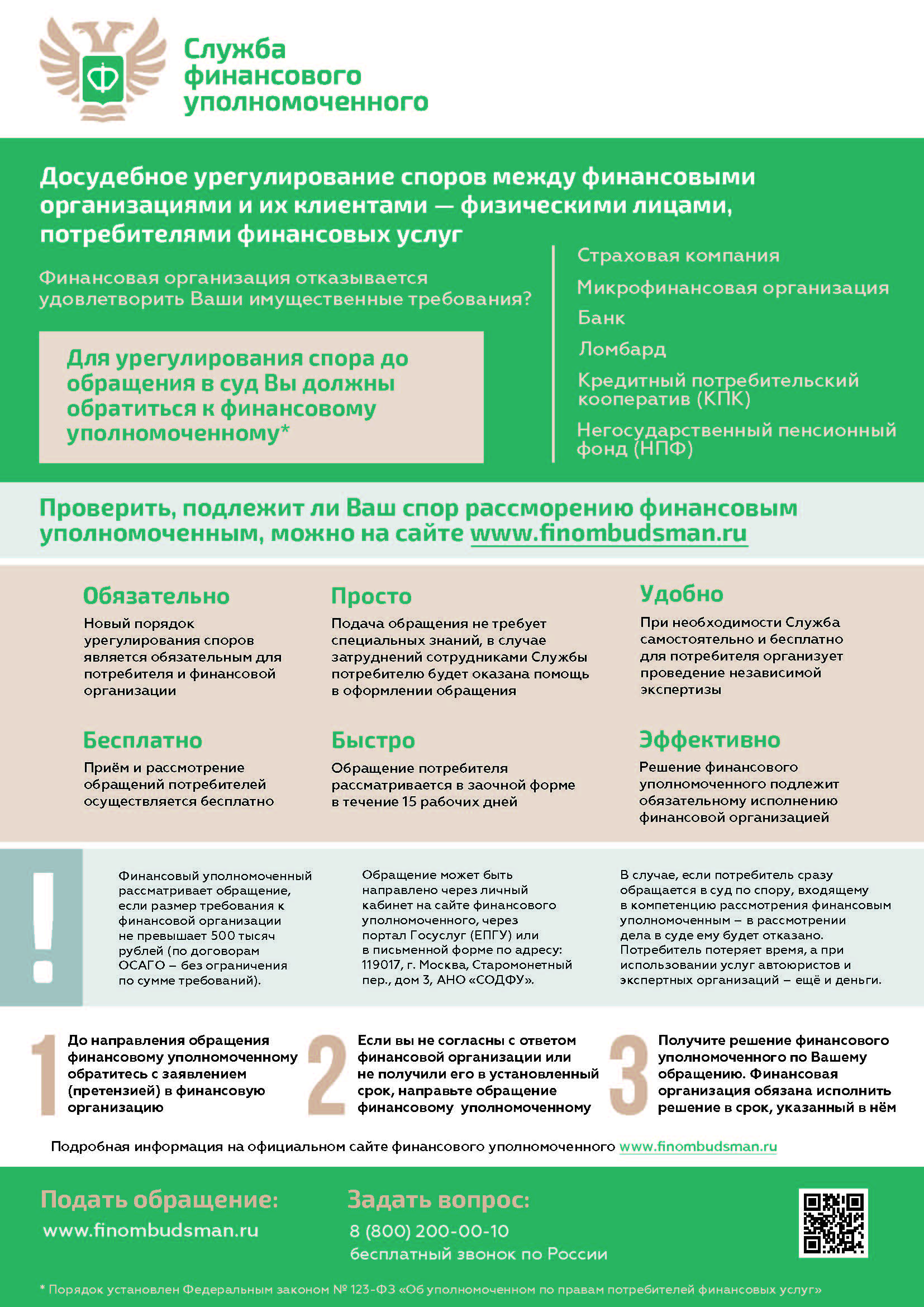 Более подробную информацию по порядку обращения можно найти на официальном сайте финансового уполномоченного www.finombudsman.ru в разделе База знаний (https://finombudsman.ru/finobr/baza-znanij/) или узнать в контактном центре по телефону 8 800 200-00-10 (звонок по России бесплатный).