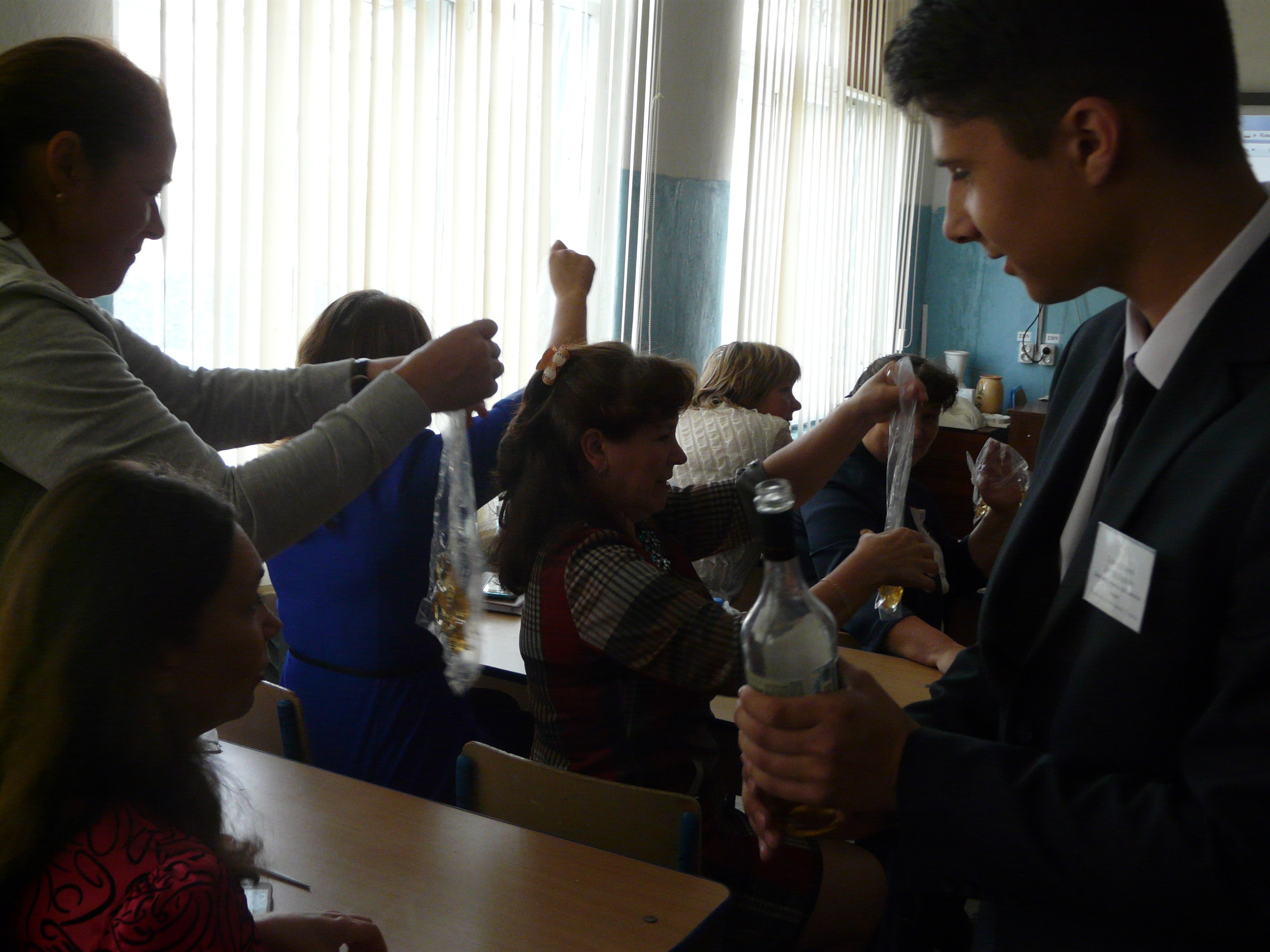 Ничего себе! Возле парты стоит «директор» Дмитрий Юрьевич и наливает «ученице» из стеклянной бутылки коричневую жидкость. Почему-то стараются попасть в небольшое отверстие в мешочке.