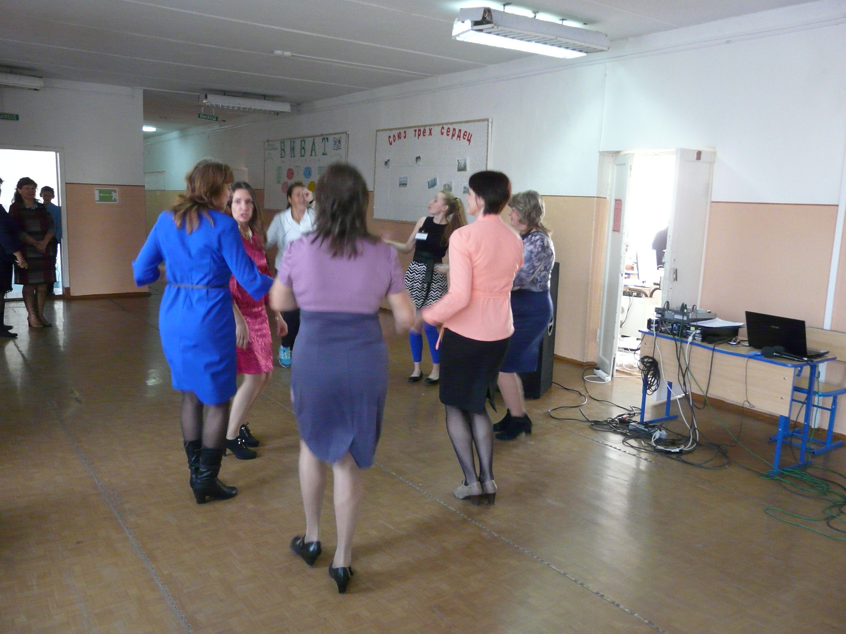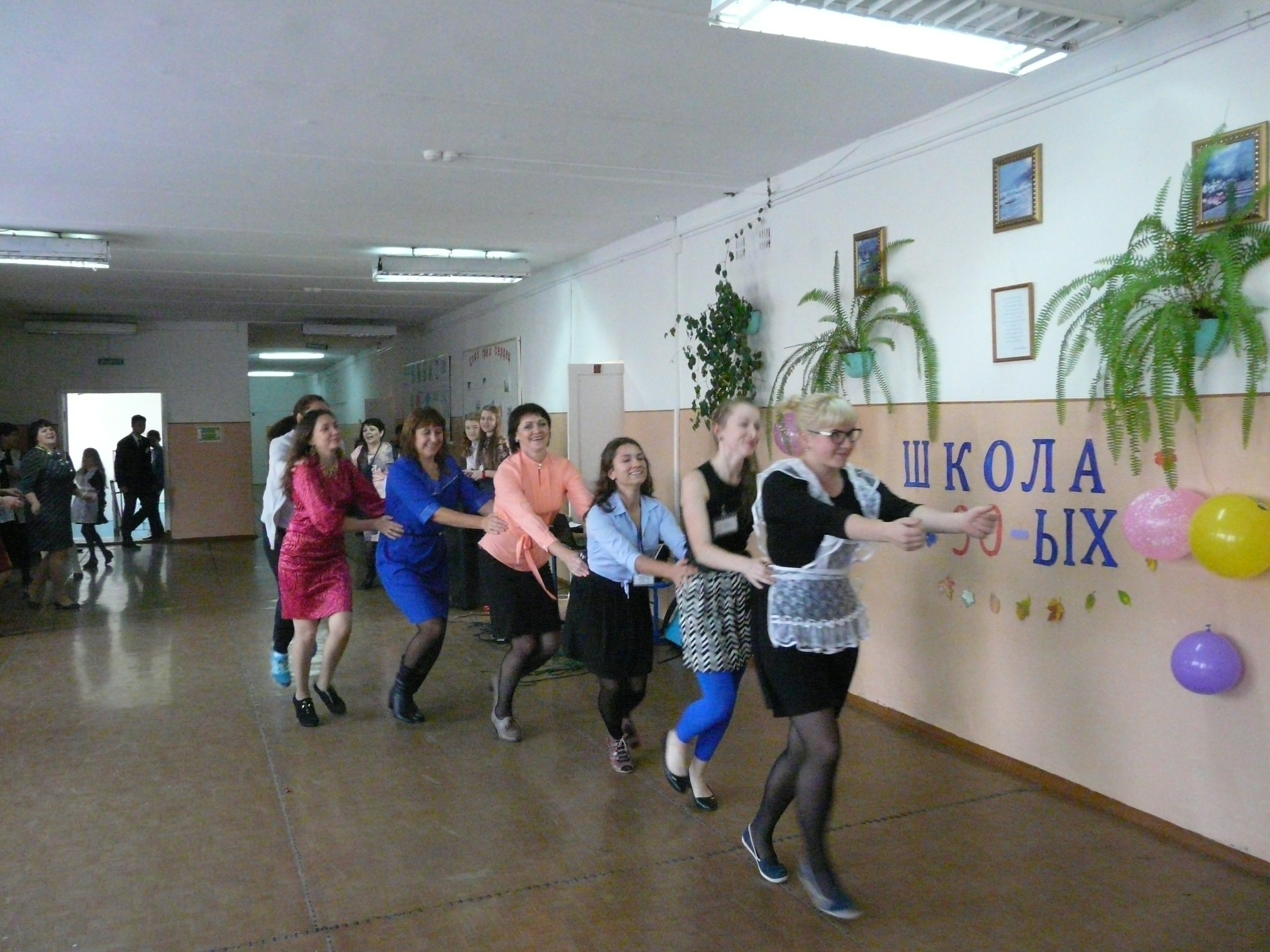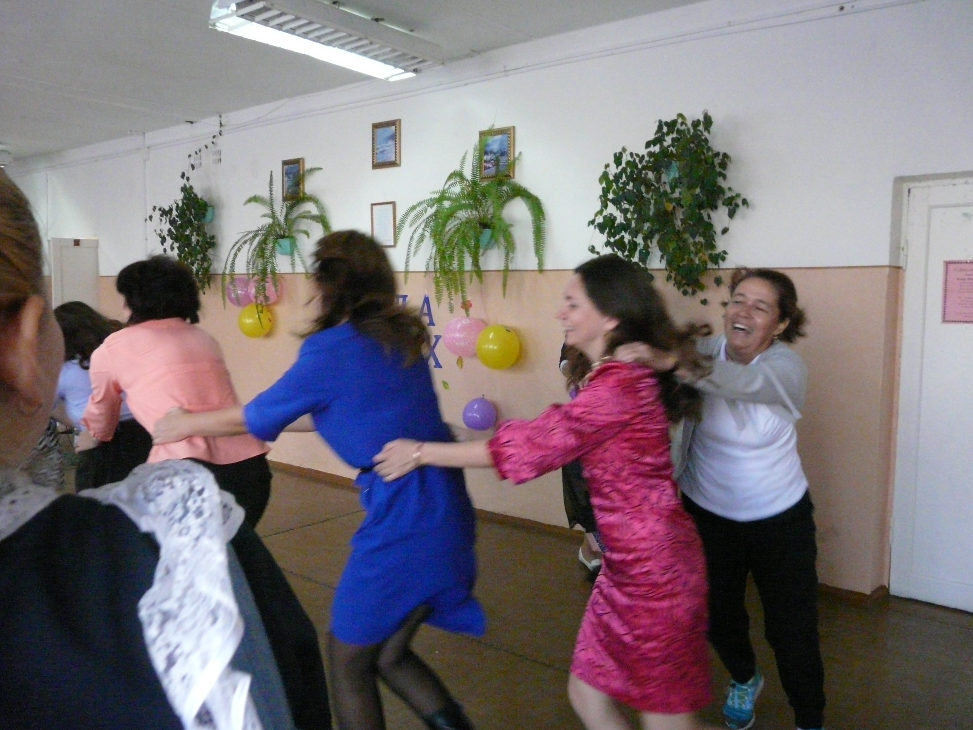 Наконец-то звонок! Урок завершился аплодисментами. Учителя идут на физкультминутку, а там сюрприз - вместо физкультуры дискотека. Танцуют все! Учителя, войдя в свои роли,- с восторгом, старшеклассники - несмело, а остальные учащиеся школы в форменных платьях и