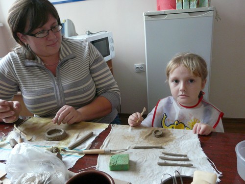 Руководителю студии помогают в этом кропотливом и хлопотном деле специалисты отделения социальной реабилитации. Сегодня восьмилетнего одессита Ванечку Корниенко опекает специалист отделения О.Н. Охрименко. А вместе с пятилетней Яночкой Коваленко трудится ее мама Анастасия Павловна. Они живут в Буняковке и на автобусе специально приезжают на занятия в "Журавушку". Лепка из глины, известно, хорошо развивает мелкую моторику рук.