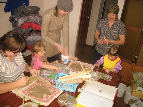 Детки увлеченно лепят из глины, а рядом обязательно - мамочки и В.М. Чибисова.