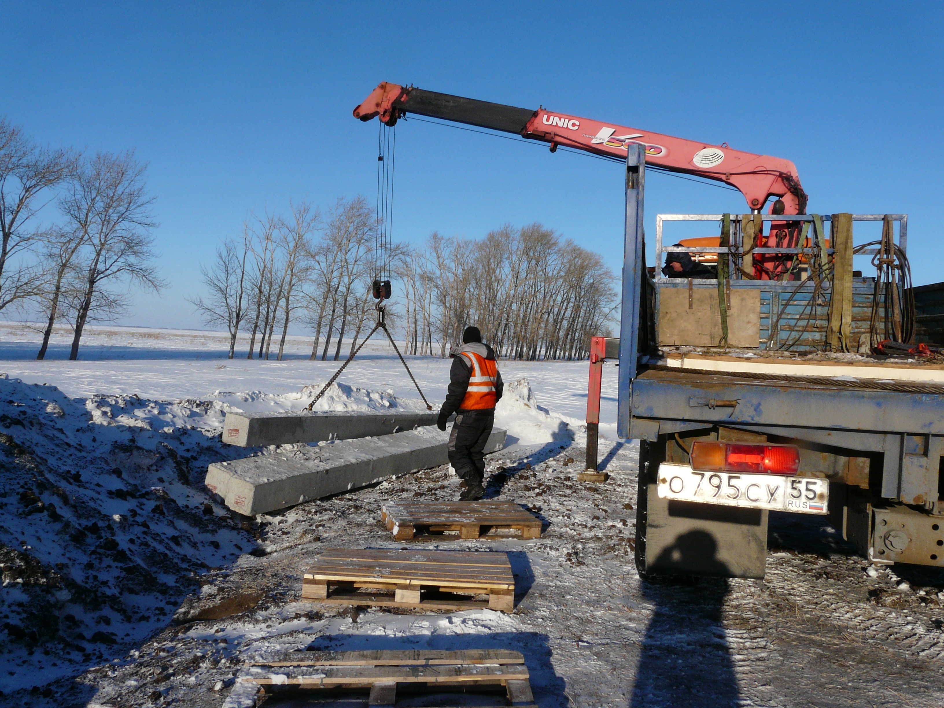 На въезде в Одесское расчищена площадка и пробурены несколько отверстий. На этой неделе рабочие предпринимателя В.А.Демченко начали готовить постамент для скульптуры орла. Наш фотообъектив застал их за разгрузкой бетонных свай.