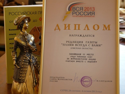 Третье место в номинации "районнные газеты" завоевала газета "Пламя" всегда с вами" Одесского района Омской области за реализацию акции "Читаем вместе с Лешкой".