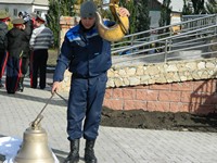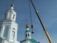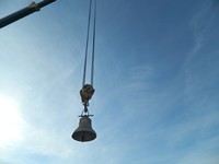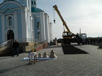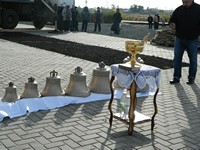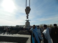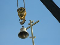И вот оно - свершилось! Под руководством индивидуального предпринимателя, депутата районного совета В.А. Демченко, строительная бригада которого внесла немалую лепту в строительство Храма, огромная стрела крана послушно наклоняется к первому из только что освященных колоколов, и вскоре он взмывает в небесную высь. Наперекор порывам ветра за первым колоколом поочередно следуют все остальные.