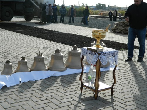 У Храма, рядом с недалеко стоящим краном, на белом покрывале в ряд выстроились шесть кампанов - так в церковном уставе называют колокола. Самый большой из них весит 150 килограммов, самый маленький - десять. Три года они терпеливо дожидались столь знаменательного дня.