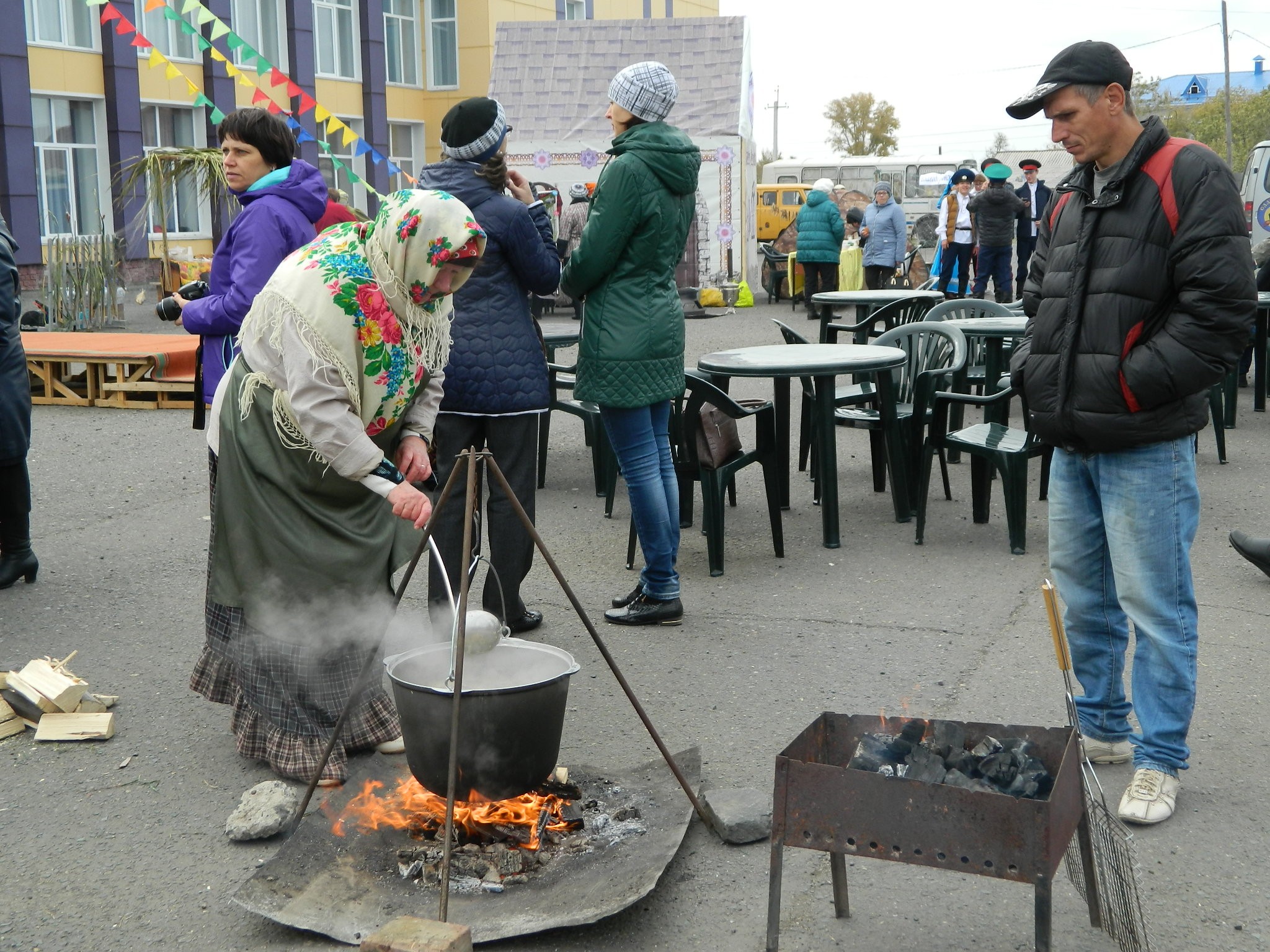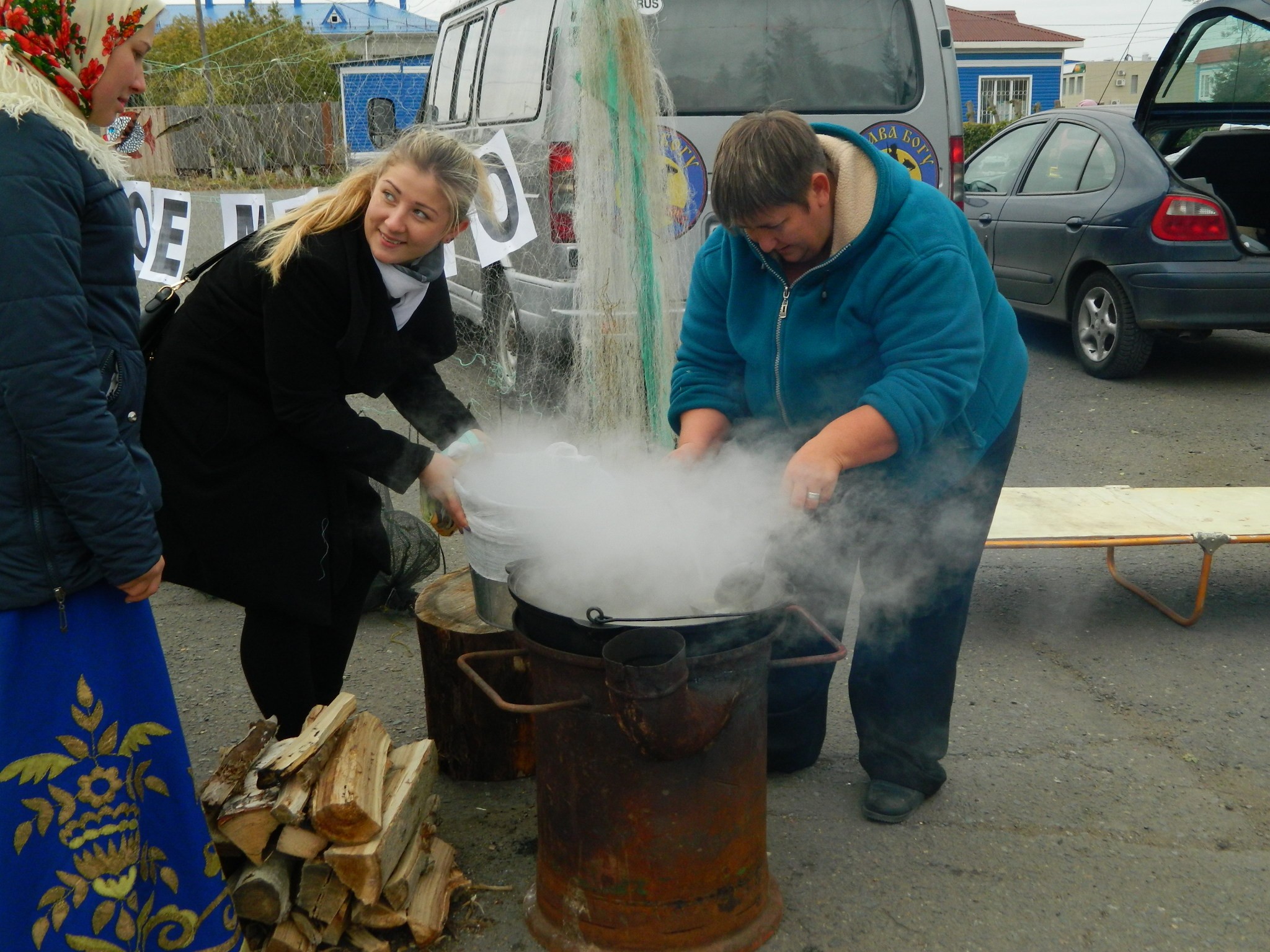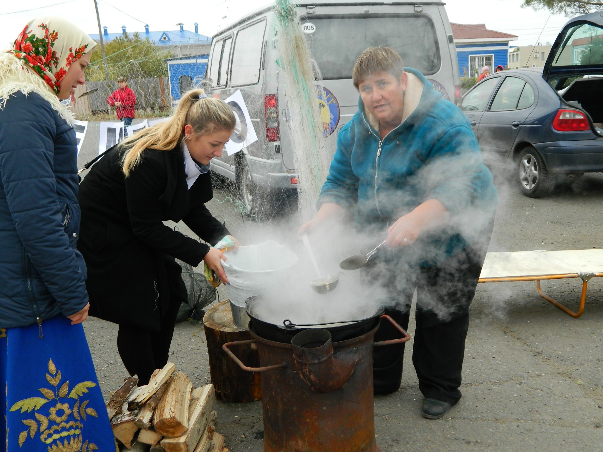 рыбацкими сетями и густыми клубами дыма, который вился из большого котла. Такие котлы и шатры – казачьи курени – словно по мановению волшебной палочки в считанные минуты появились в разных местах большой площади районного Дома культуры. Рядом с ними мужчины в казачьей форме умело разводили огонь. Женщины в красивых цветастых