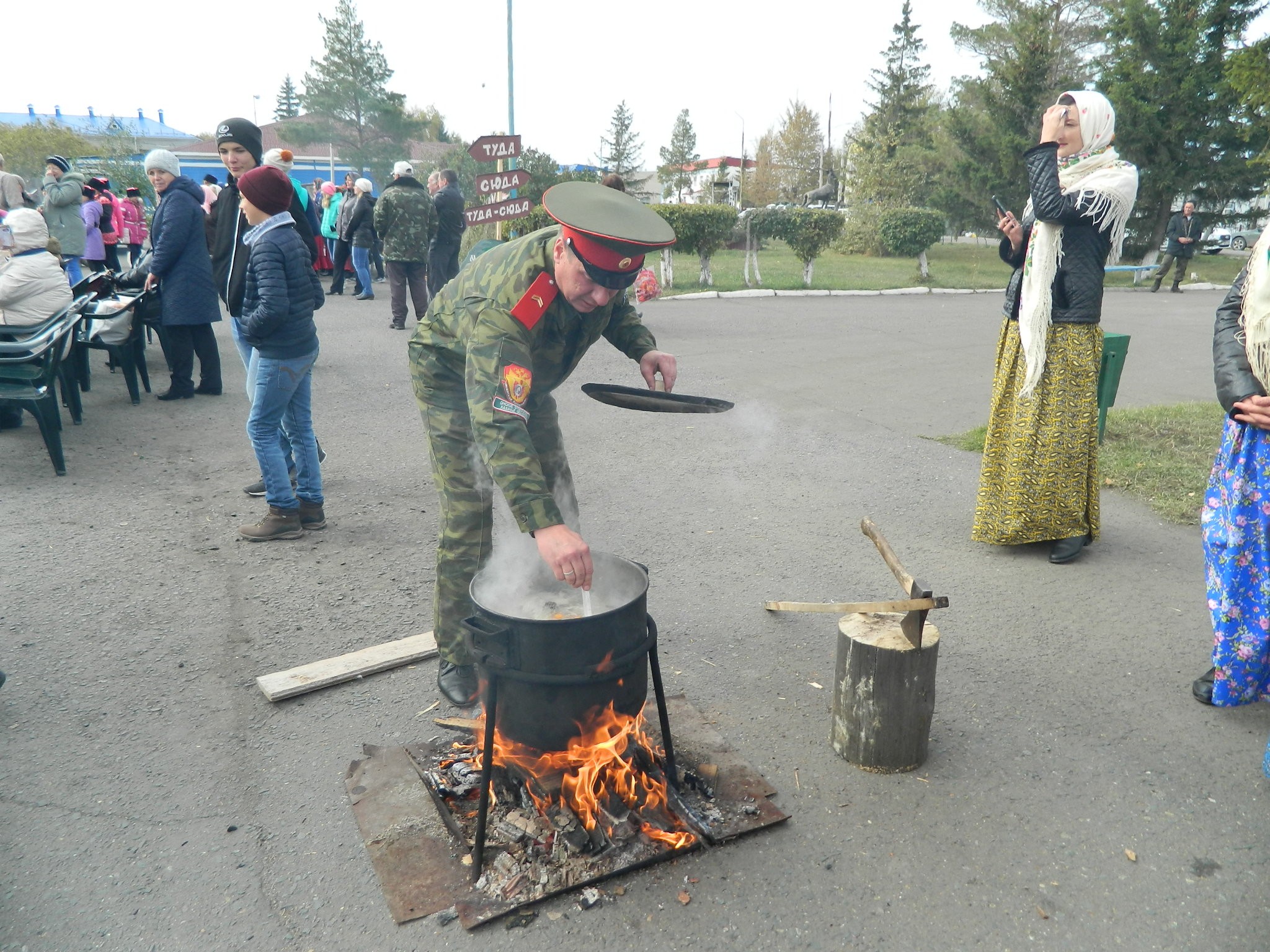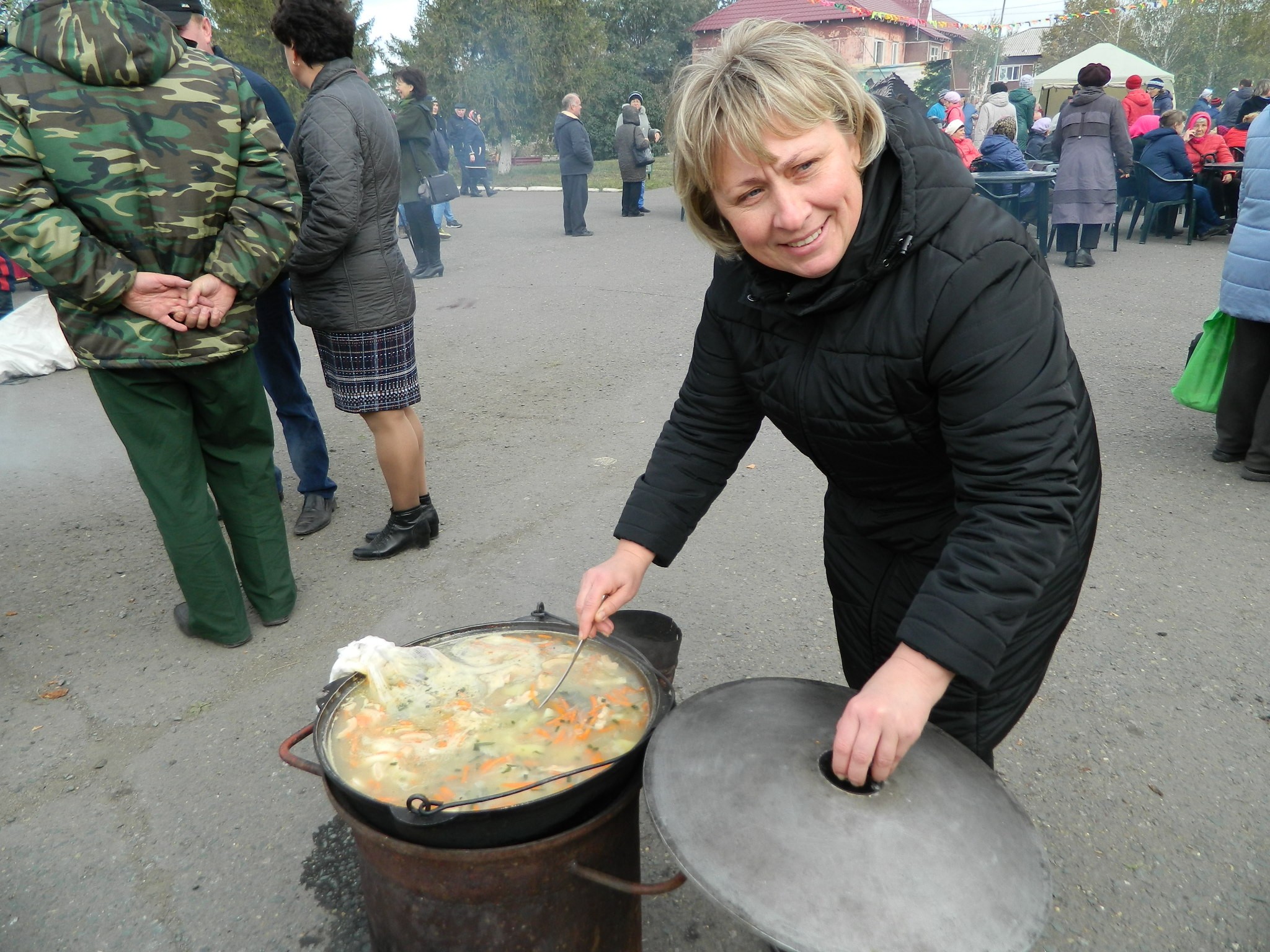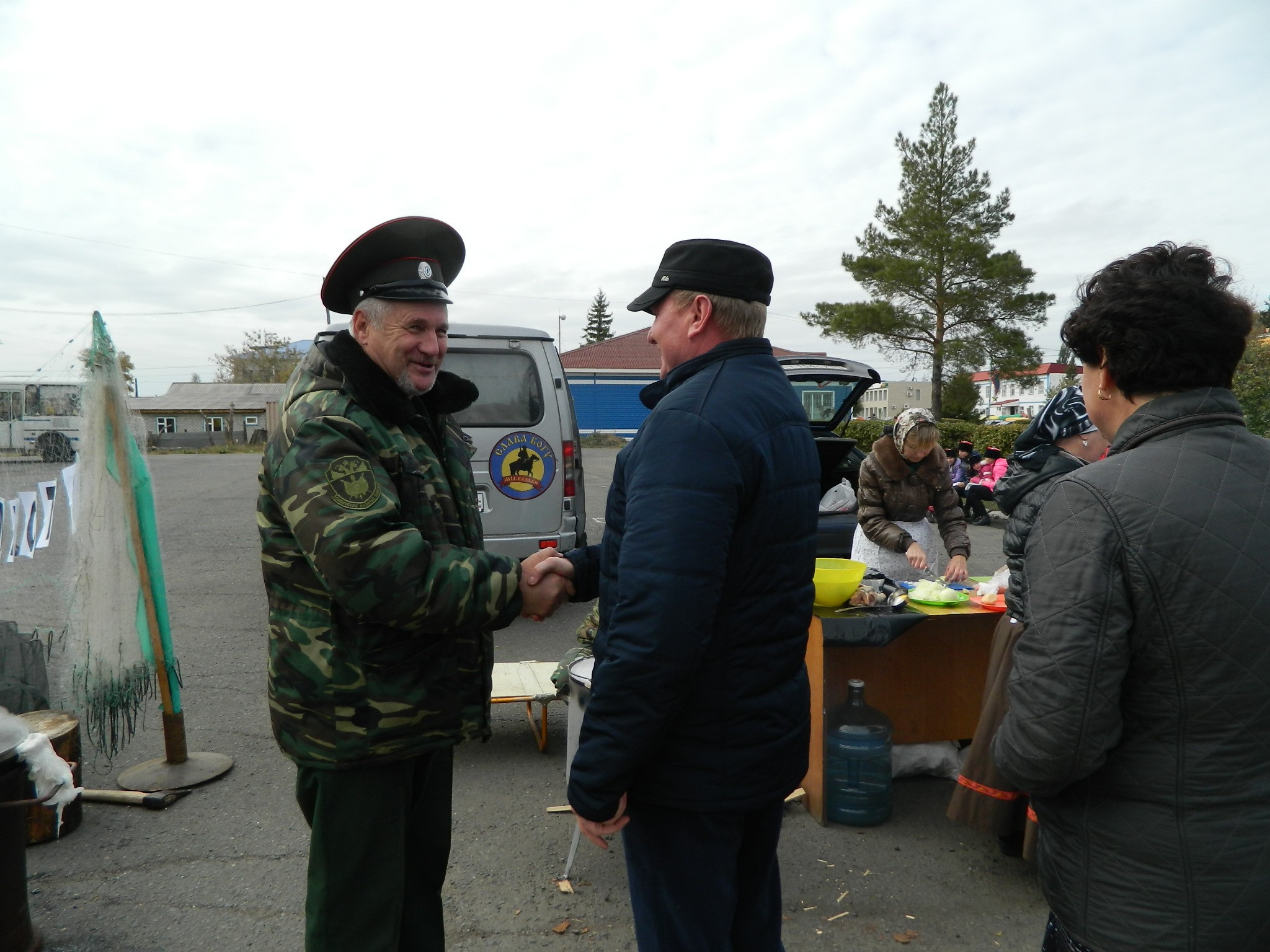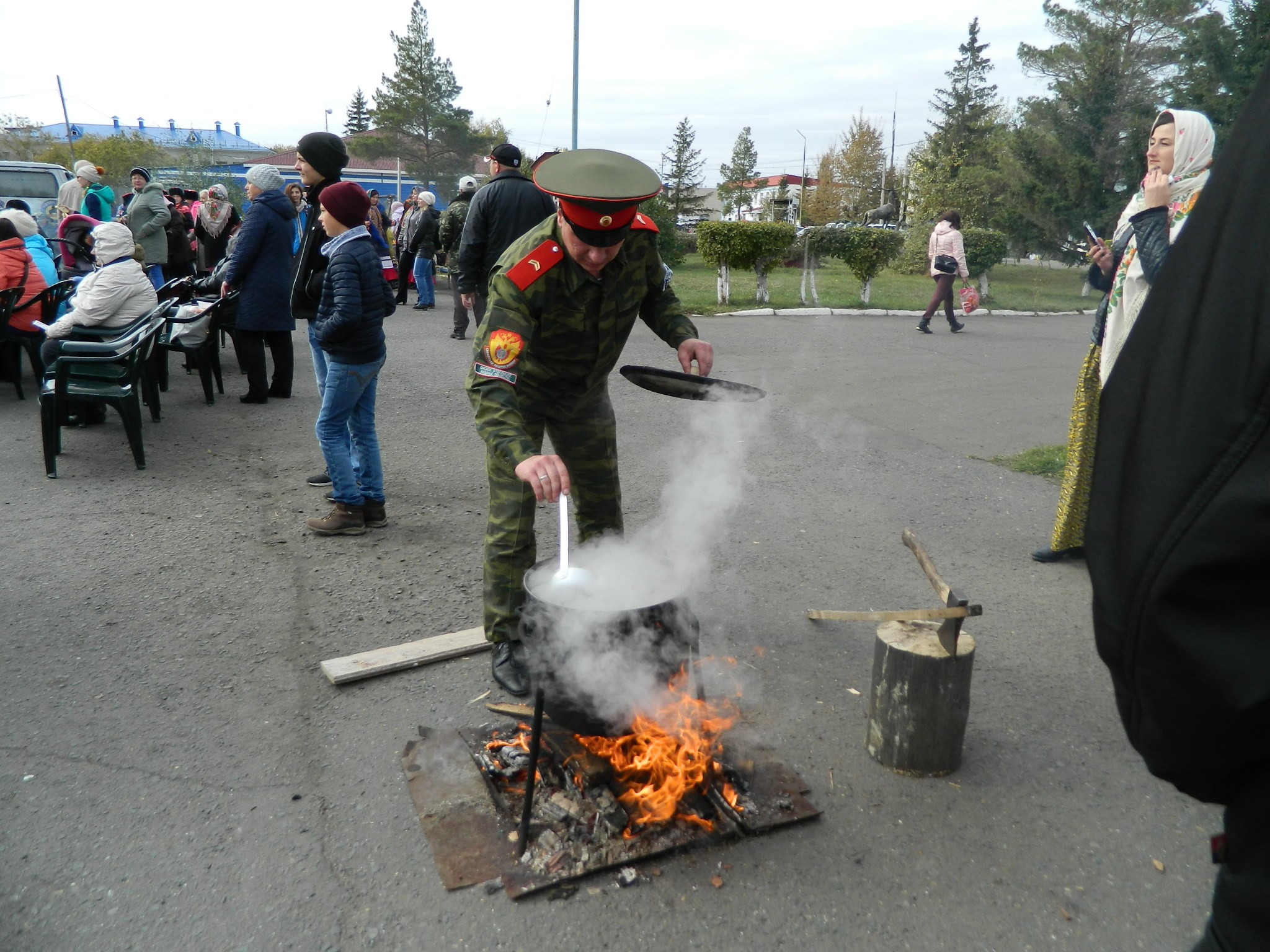 рыбацкими сетями и густыми клубами дыма, который вился из большого котла. Такие котлы и шатры – казачьи курени – словно по мановению волшебной палочки в считанные минуты появились в разных местах большой площади районного Дома культуры. Рядом с ними мужчины в казачьей форме умело разводили огонь. Женщины в красивых цветастых