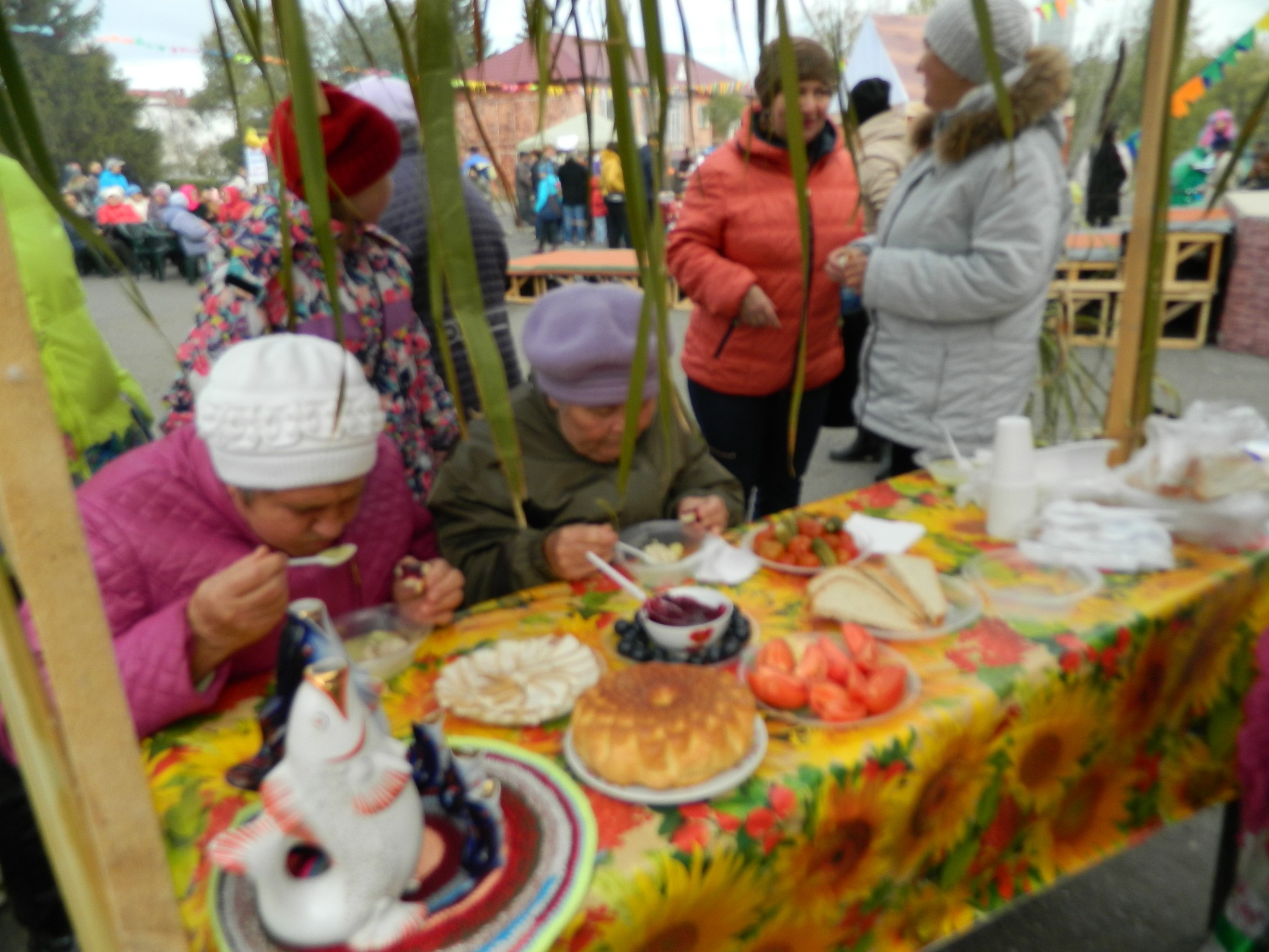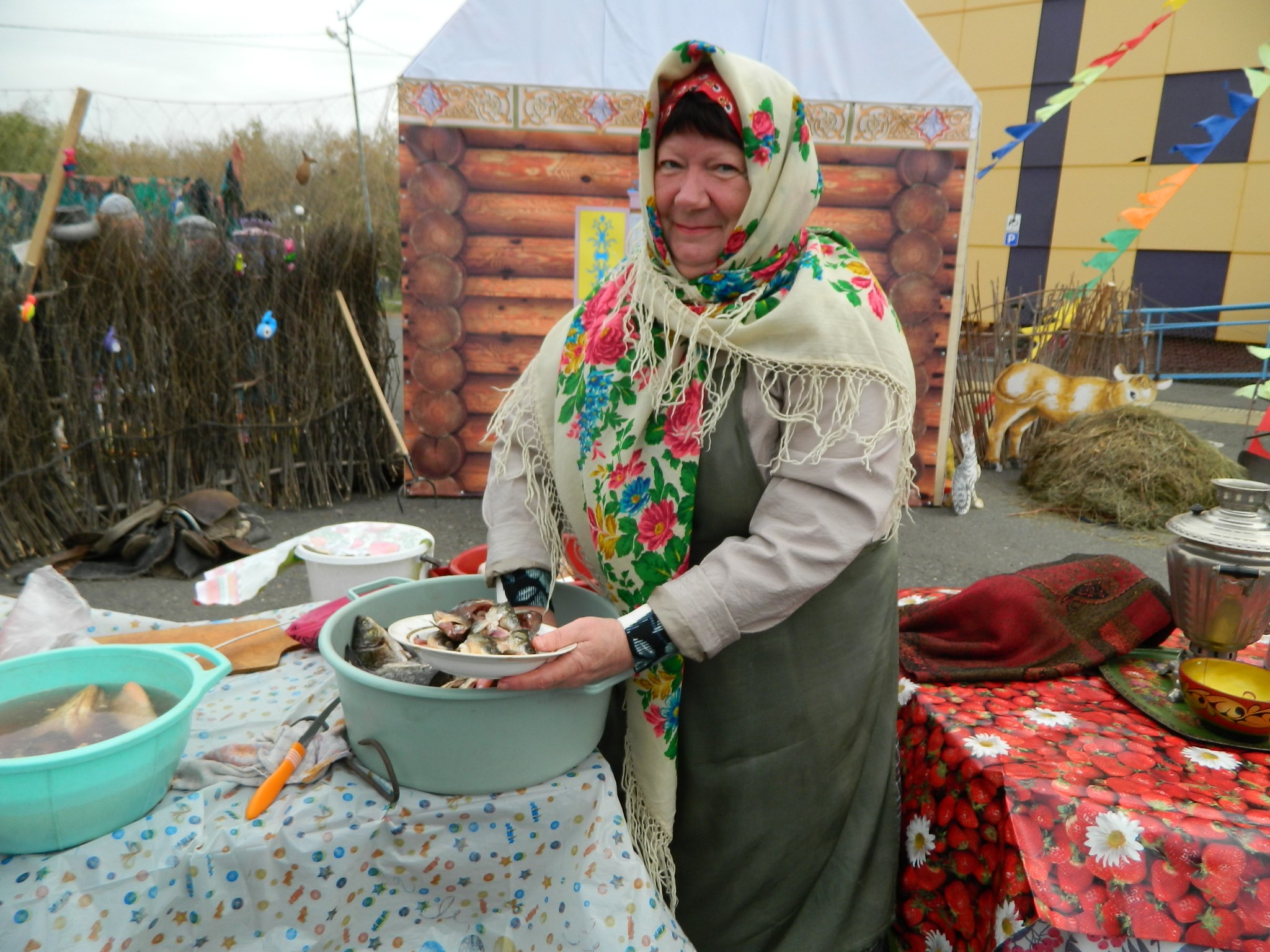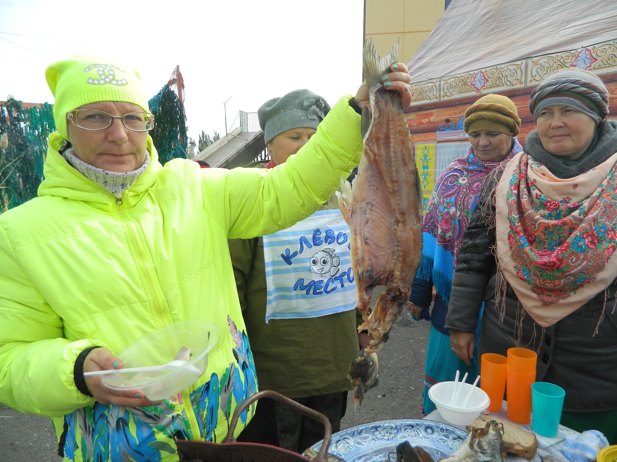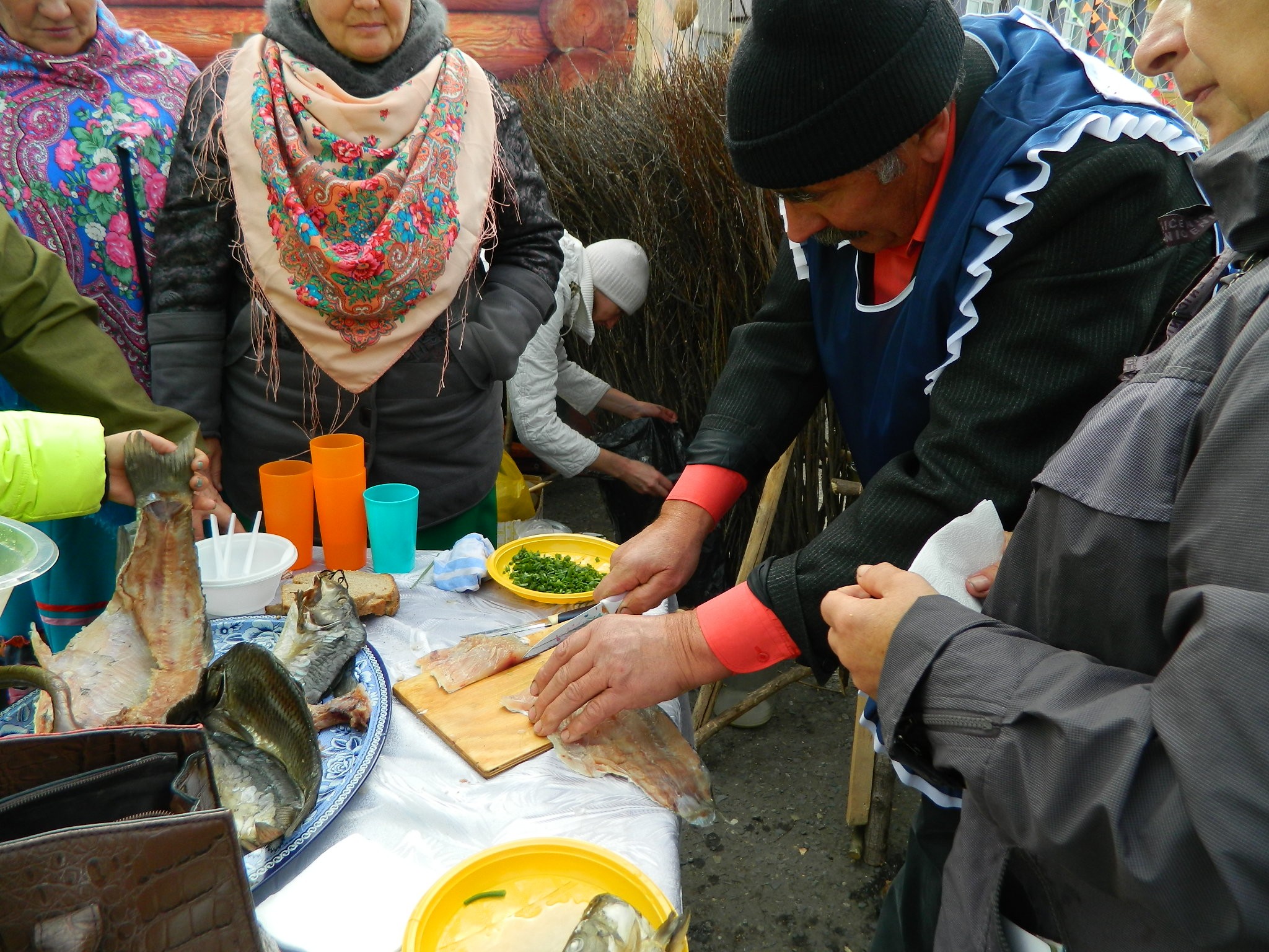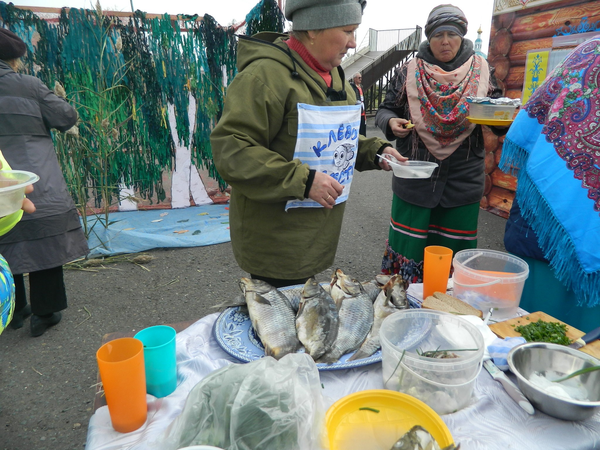 платках и длинных юбках на деревянных столах, накрытых яркими клеёнками, делали аппетитные нарезки, выкладывали расстегаи, бутерброды с рыбой, просто жареную рыбу, красиво украшенную, на больших блюдах.