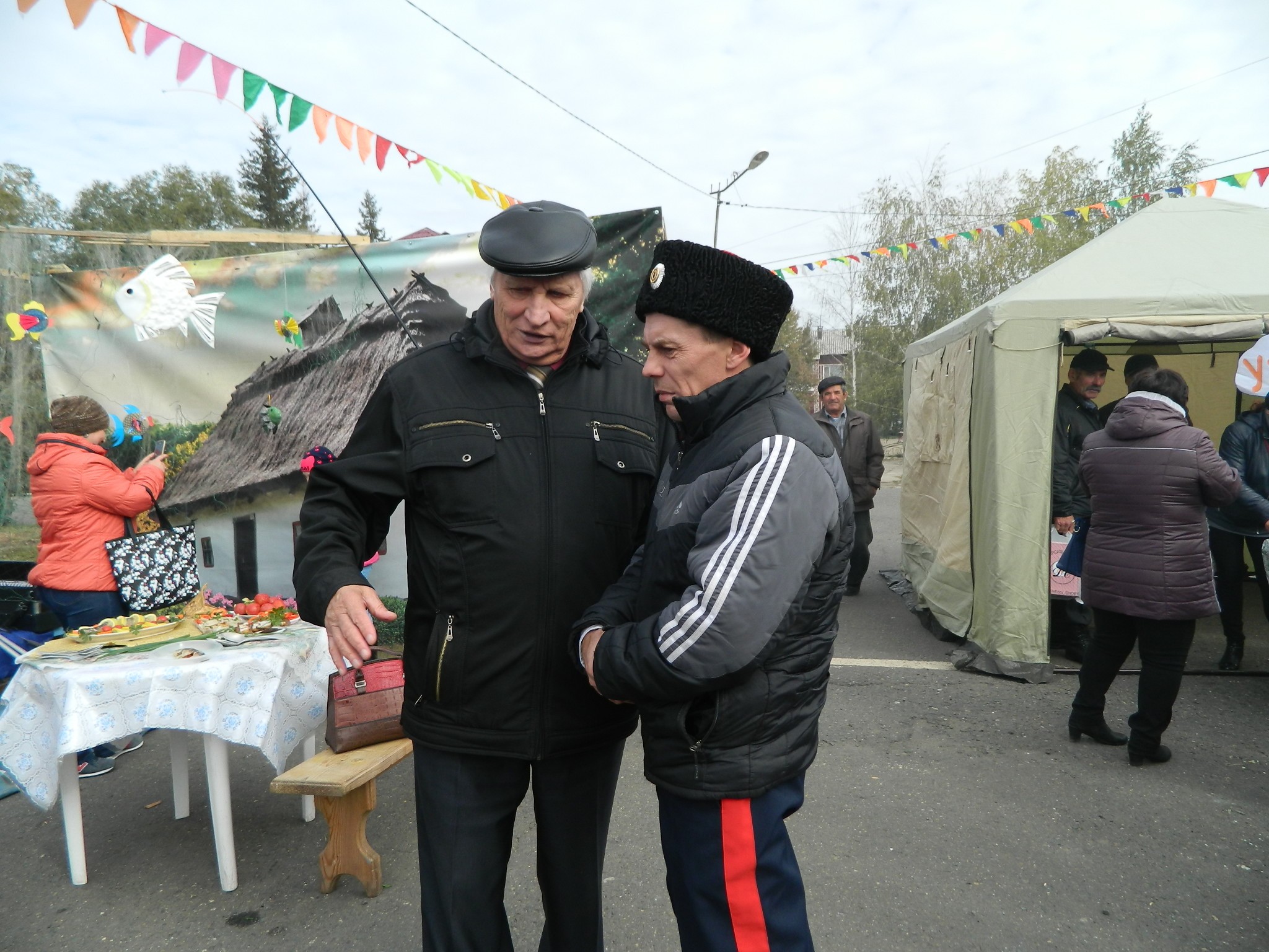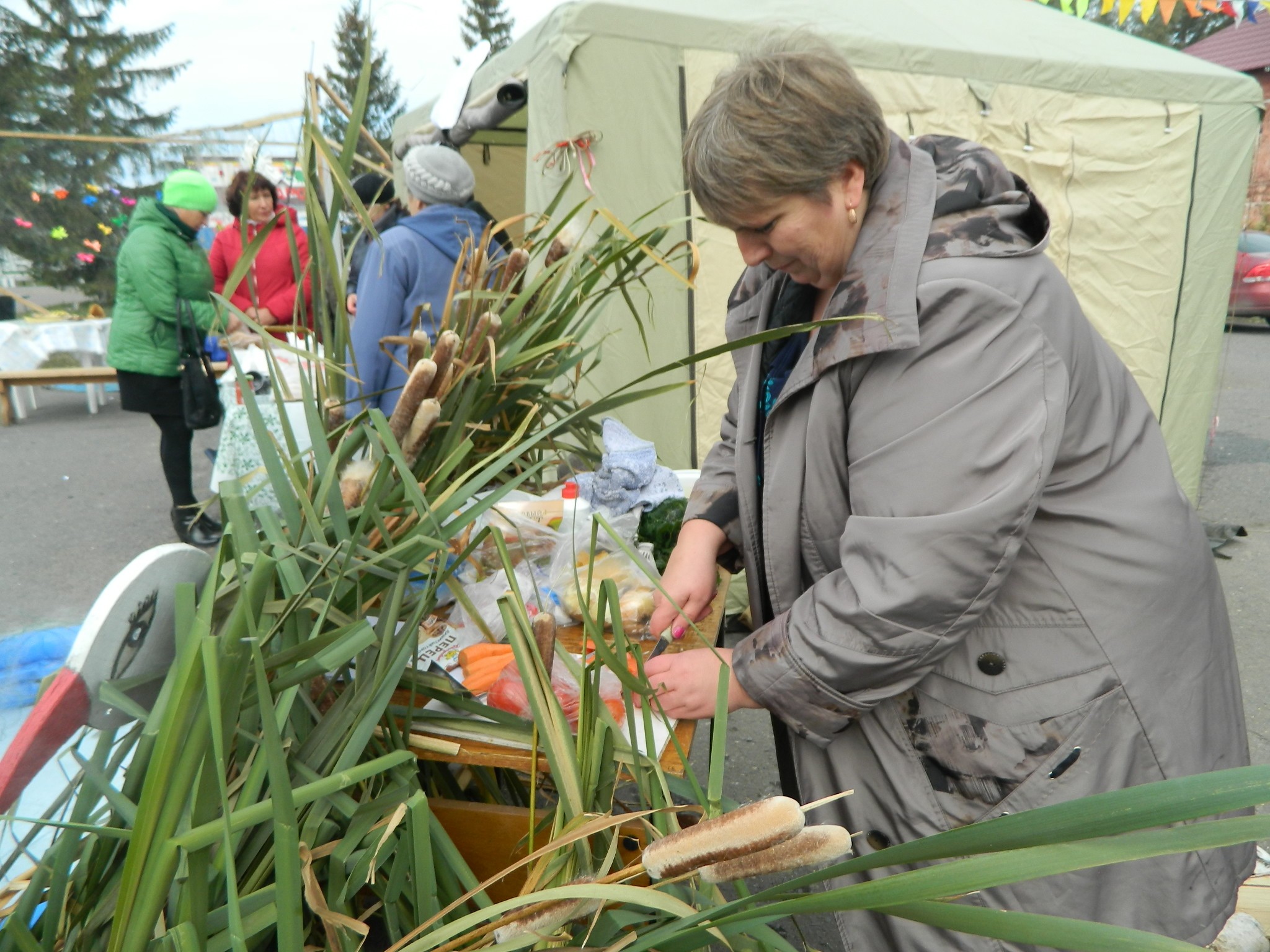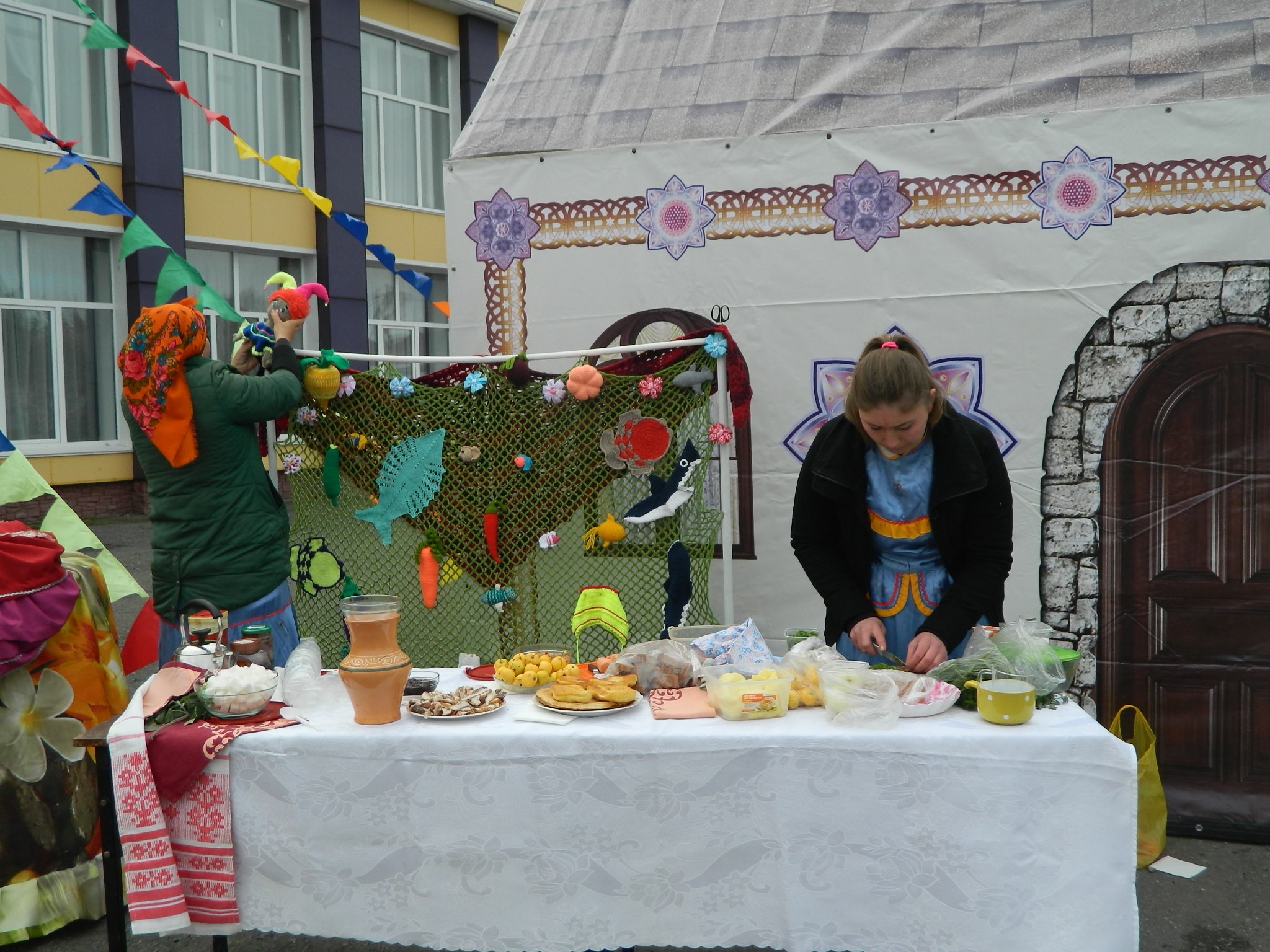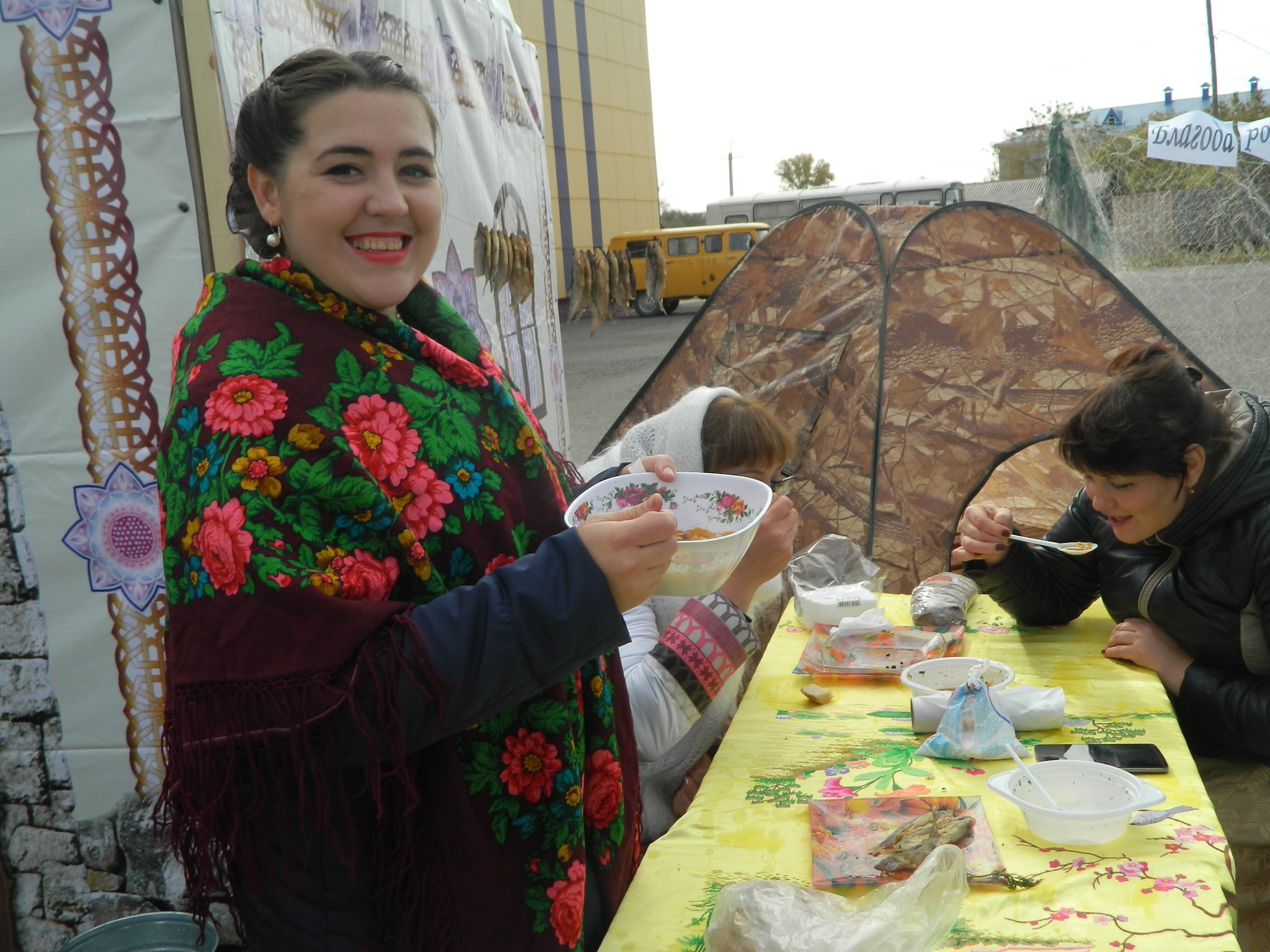 платках и длинных юбках на деревянных столах, накрытых яркими клеёнками, делали аппетитные нарезки, выкладывали расстегаи, бутерброды с рыбой, просто жареную рыбу, красиво украшенную, на больших блюдах.