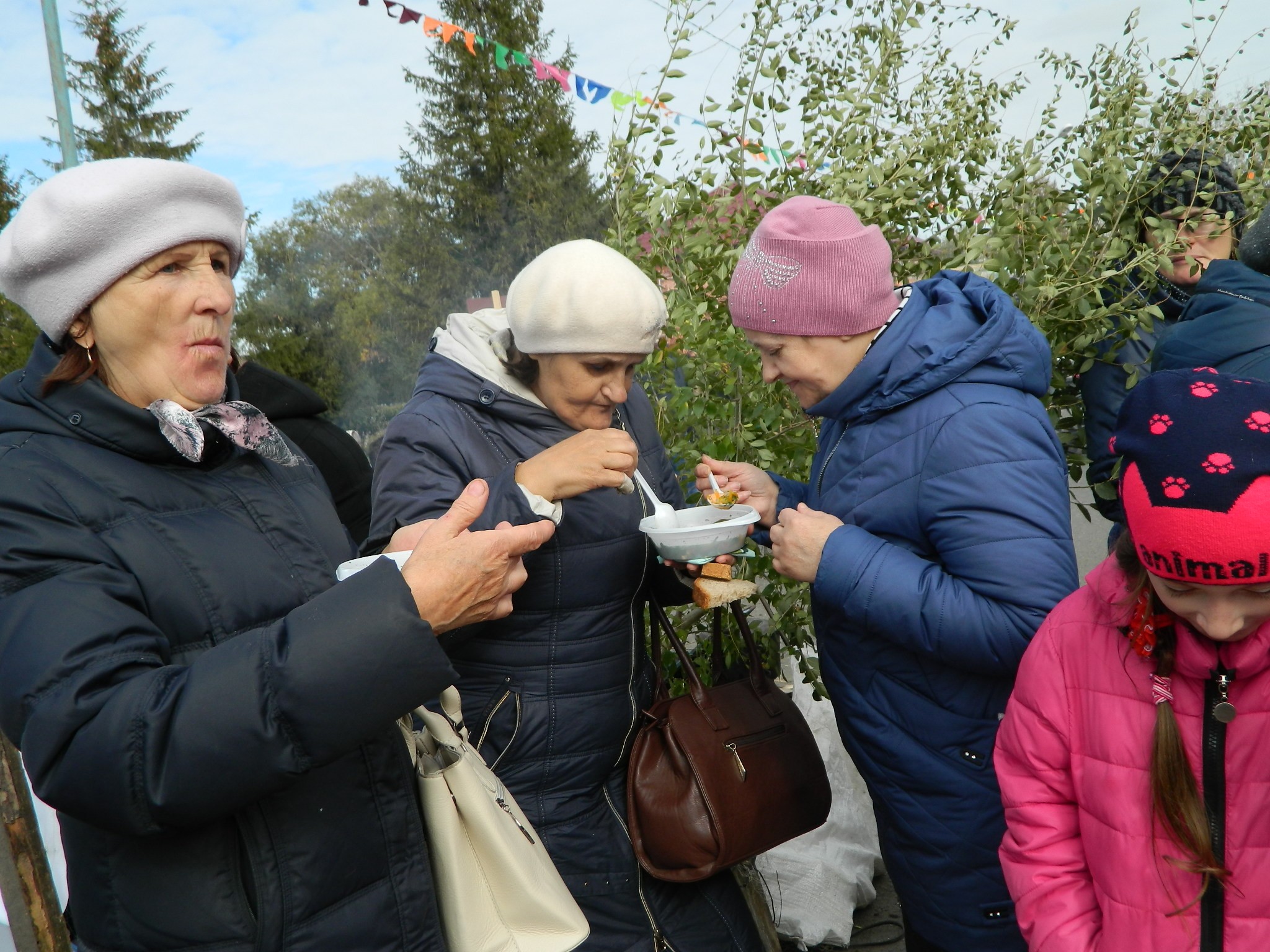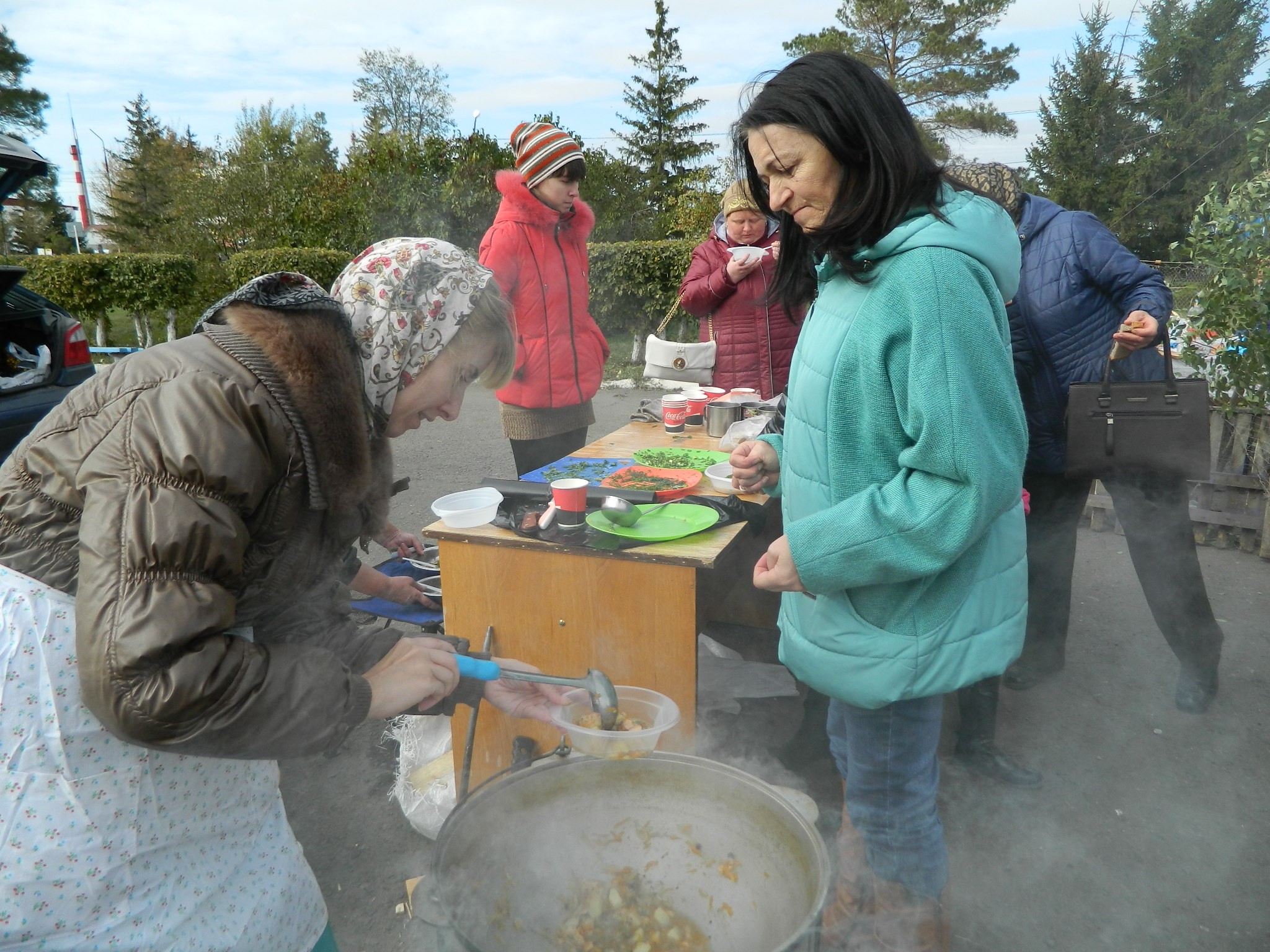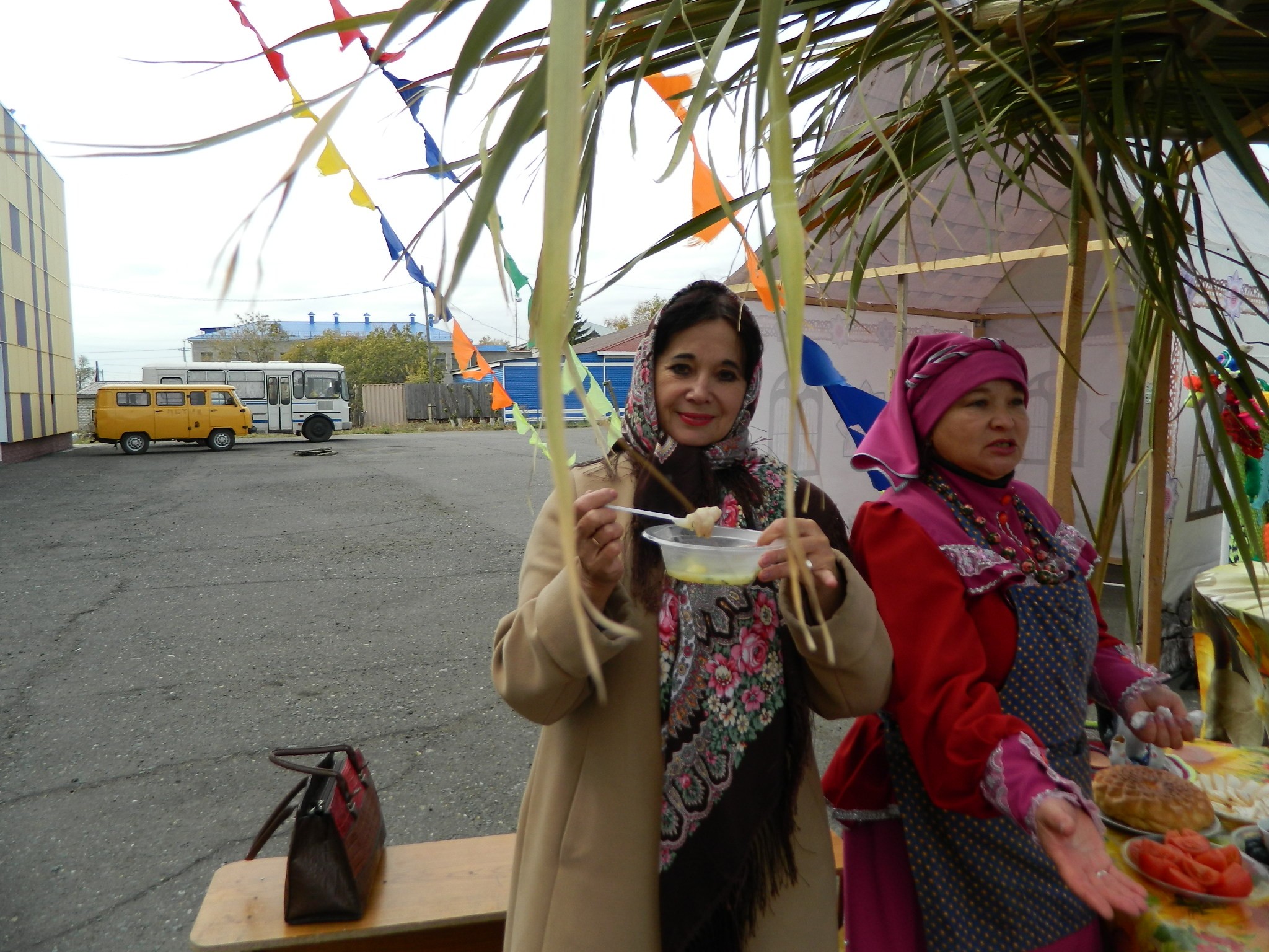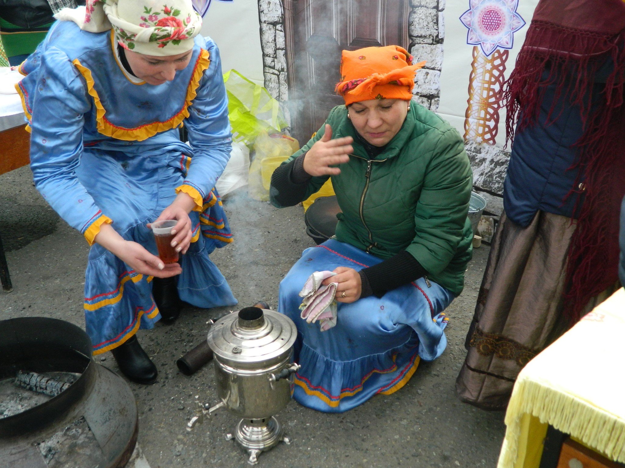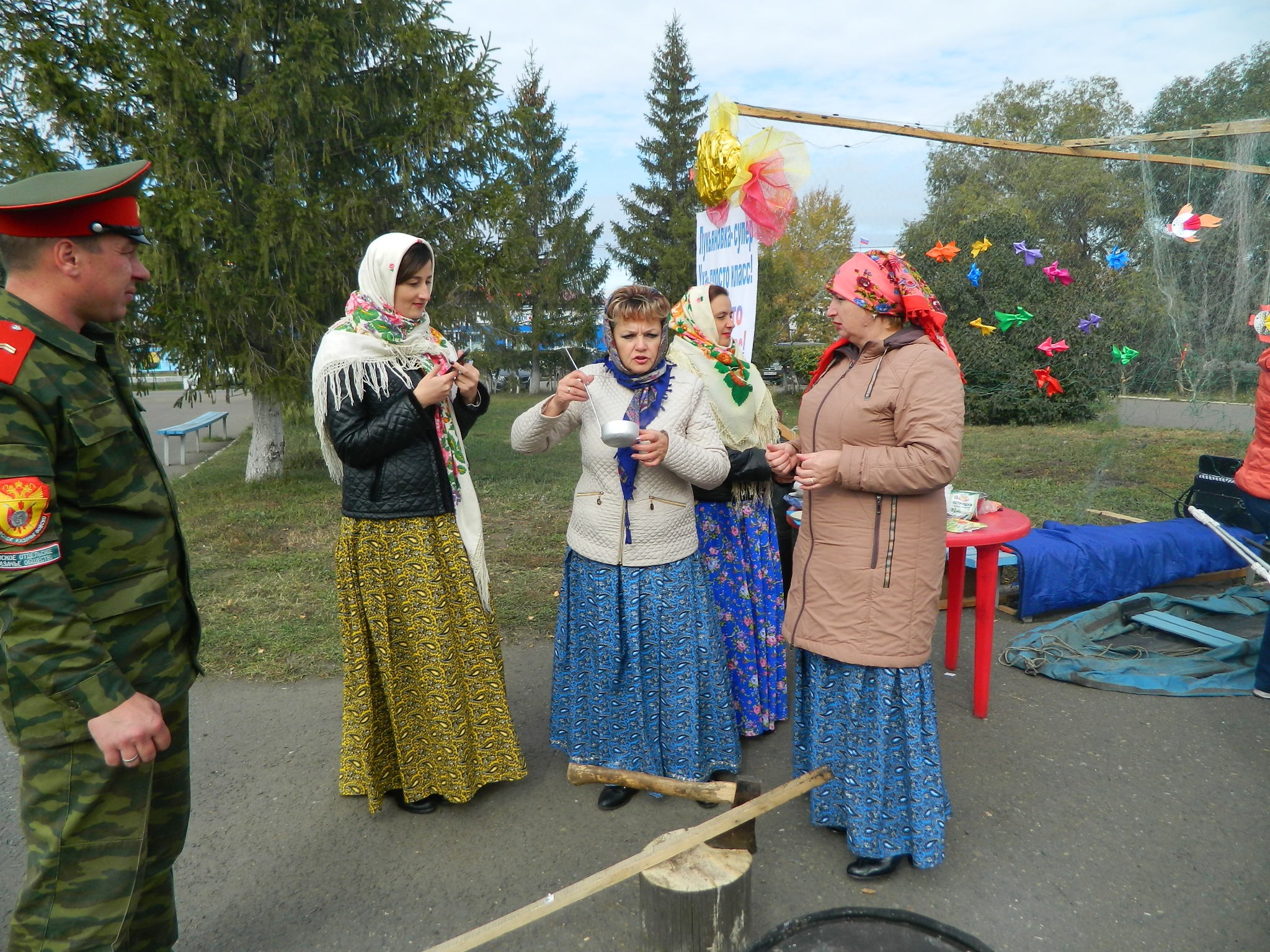 платках и длинных юбках на деревянных столах, накрытых яркими клеёнками, делали аппетитные нарезки, выкладывали расстегаи, бутерброды с рыбой, просто жареную рыбу, красиво украшенную, на больших блюдах.