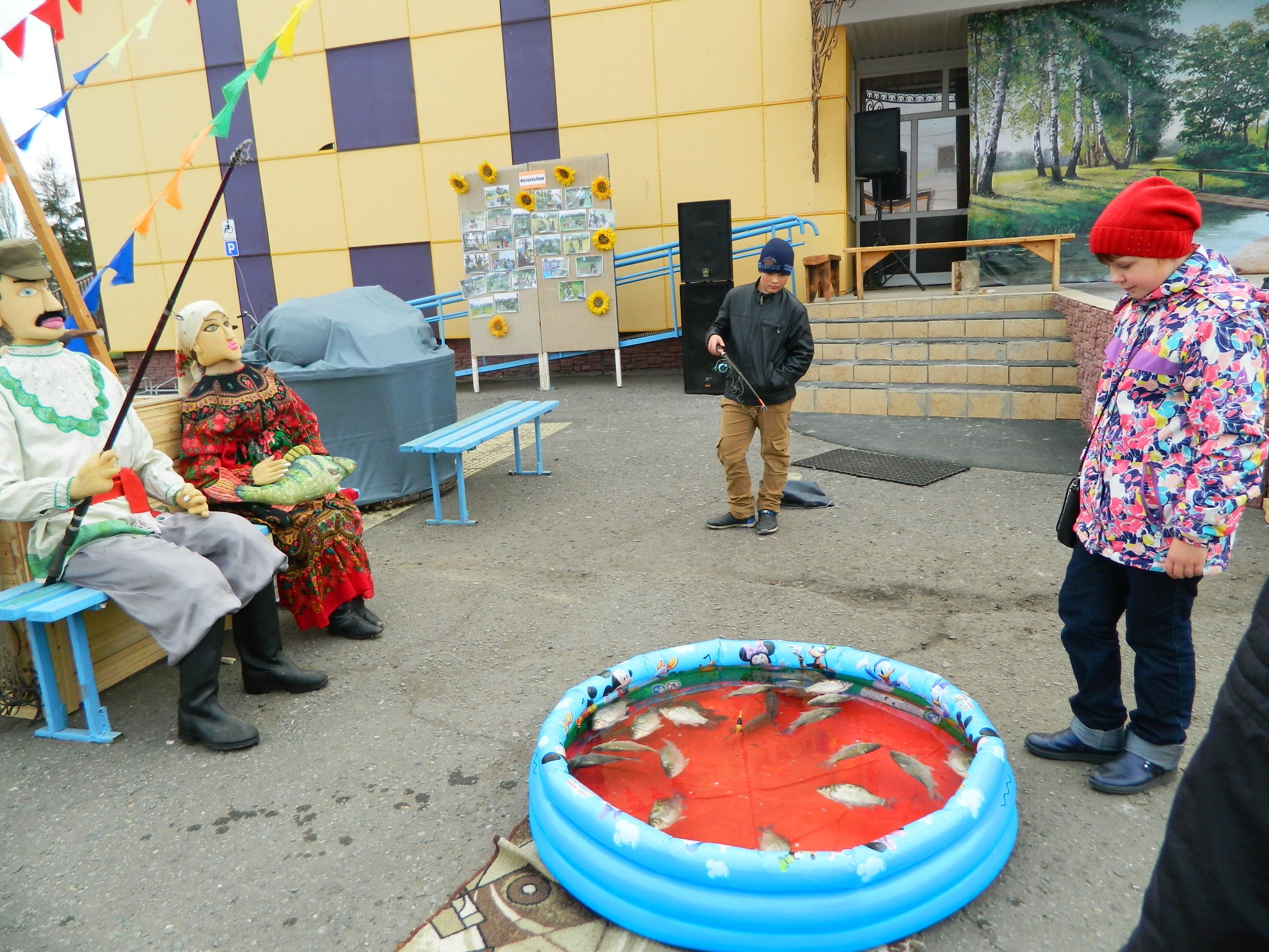 небольшим резиновым бассейном, в котором плескалась живая рыба, склонились дети. Желающие могли поймать её прямо здесь же, на удочку. Живых рыбёшек ребятам было явно жаль и на удочку они с удовольствием ловили огромных… бутафорских карасей.
