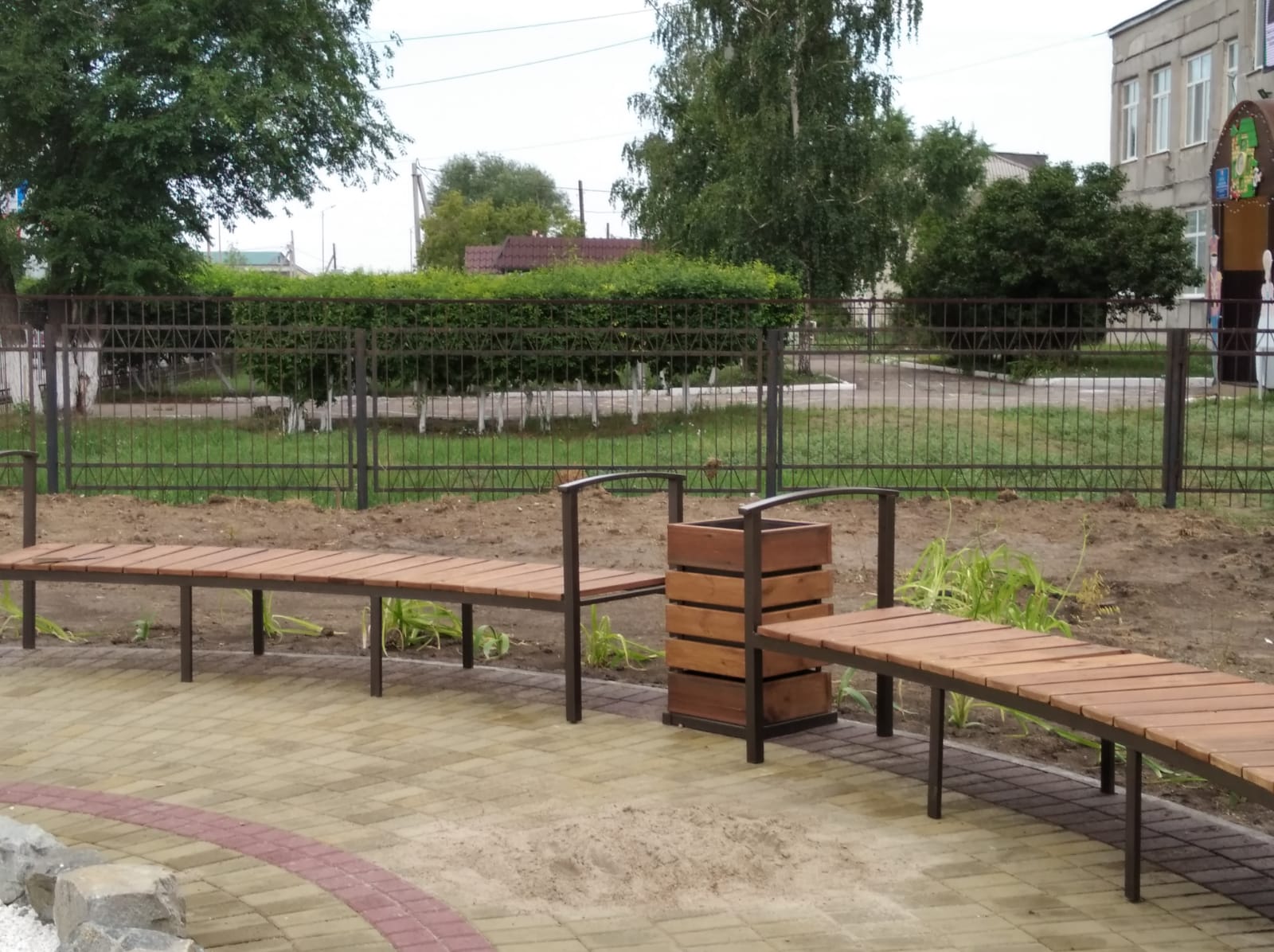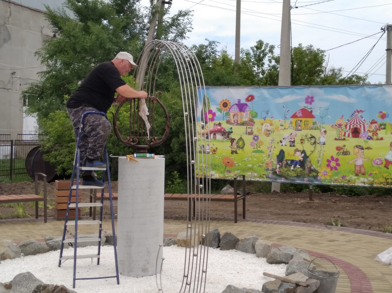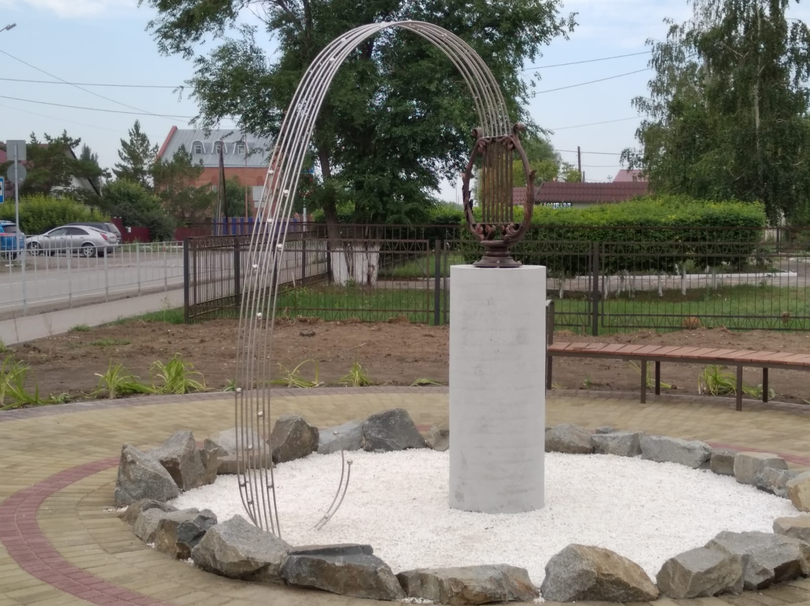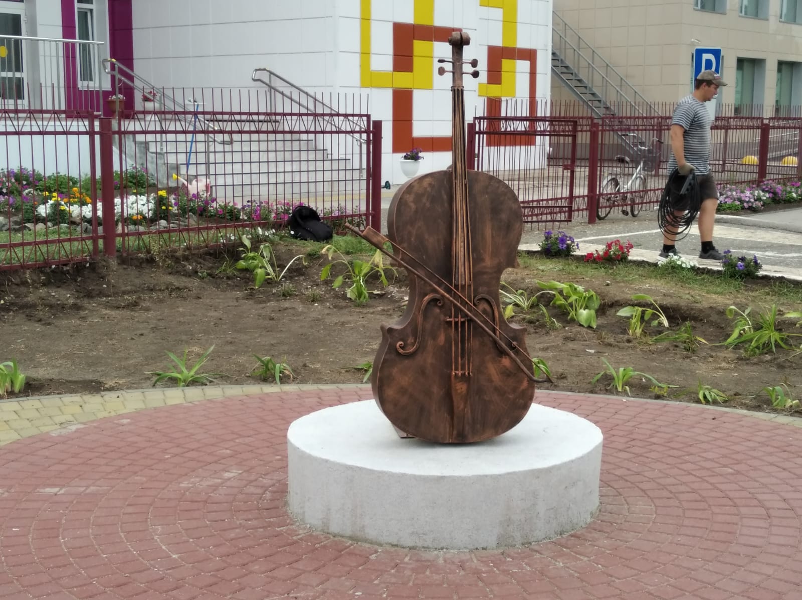 Буквально за месяц на газоне между зданиями Дома детского творчества и Детской школы искусств построили площадку в виде гитары из разноцветной плитки. Теперь здесь есть и сухой фонтан, и лавочки, и урны для мусора, и две необычные скульптуры из металла – арфа и виолончель.