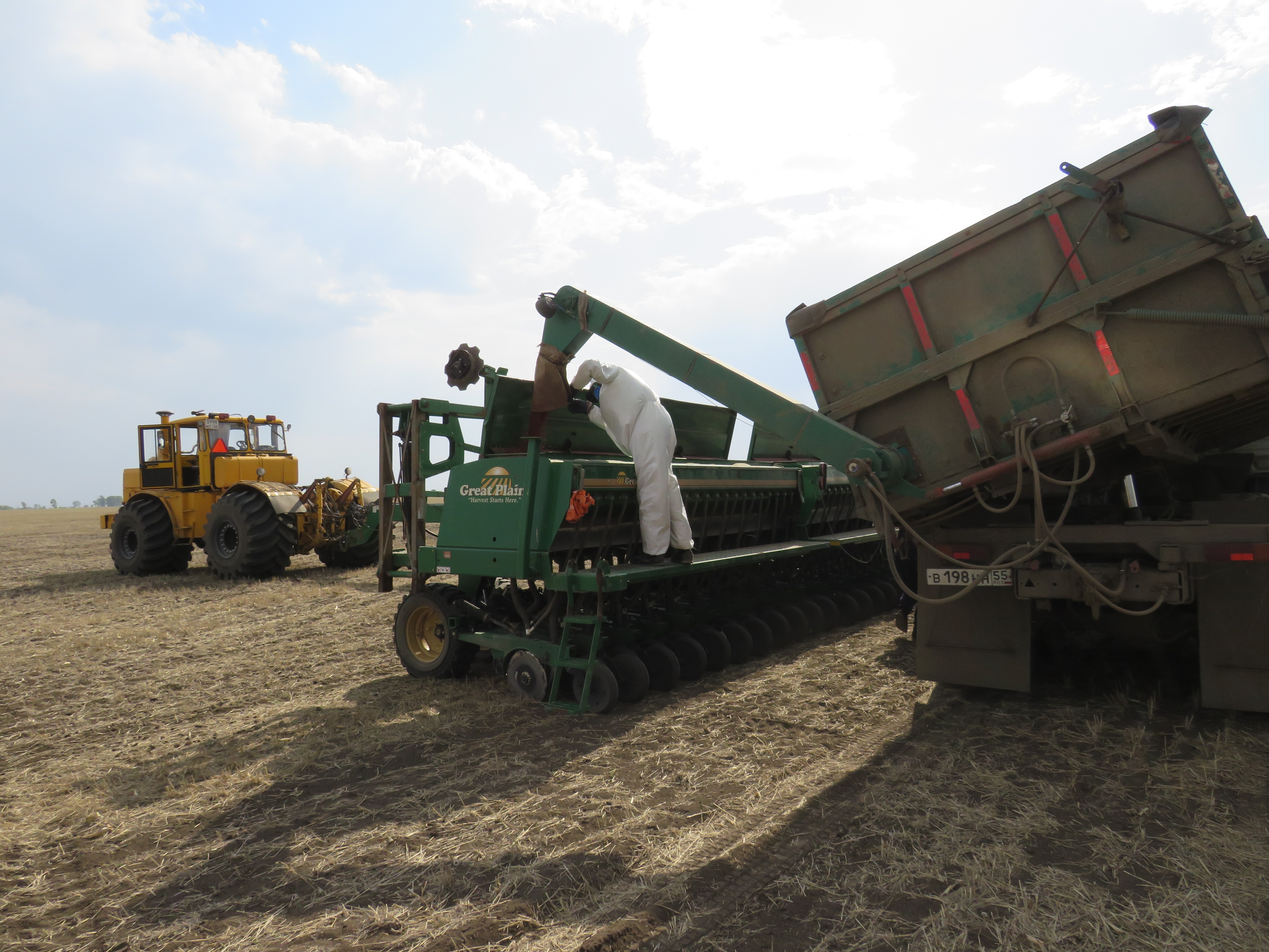 - Давайте вместе подождём соколика нашего, он скоро на дозаправку семенами остановится. Весь день мы в сеялку то семена засыпаем, то удобрения. Ночью тоже, сейчас круглосуточно работаем.