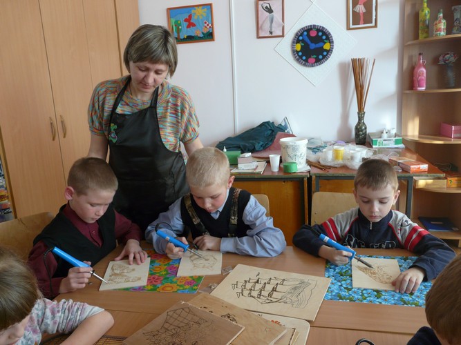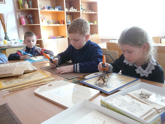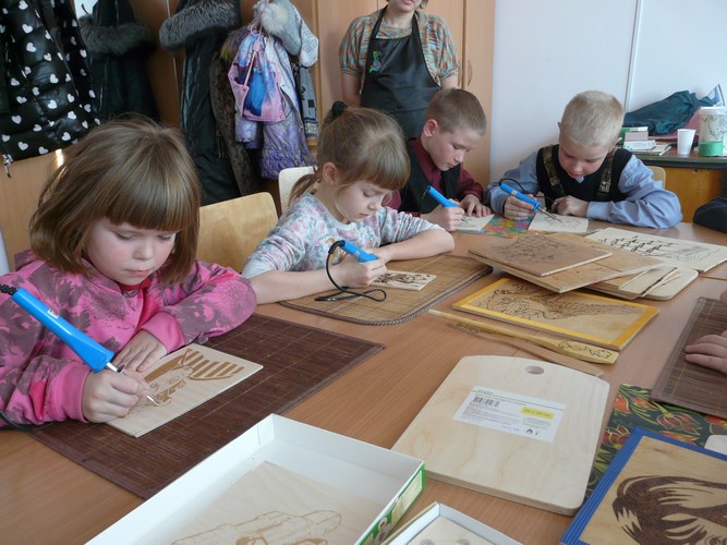 Совсем недавно произошло радостное событие: в кружке появились сразу шесть новехоньких выжигательных аппаратов! По просьбе Натальи Викторовны деньги на их покупку предоставил генеральный директор консалтинговой компании «Эксперт», депутат райсовета Е.В. Шнайдер. Подаренных 5000 рублей хватило еще и на наборы для детского творчества (заготовки для выжигания из фанеры), разделочные доски, кухонные лопатки.