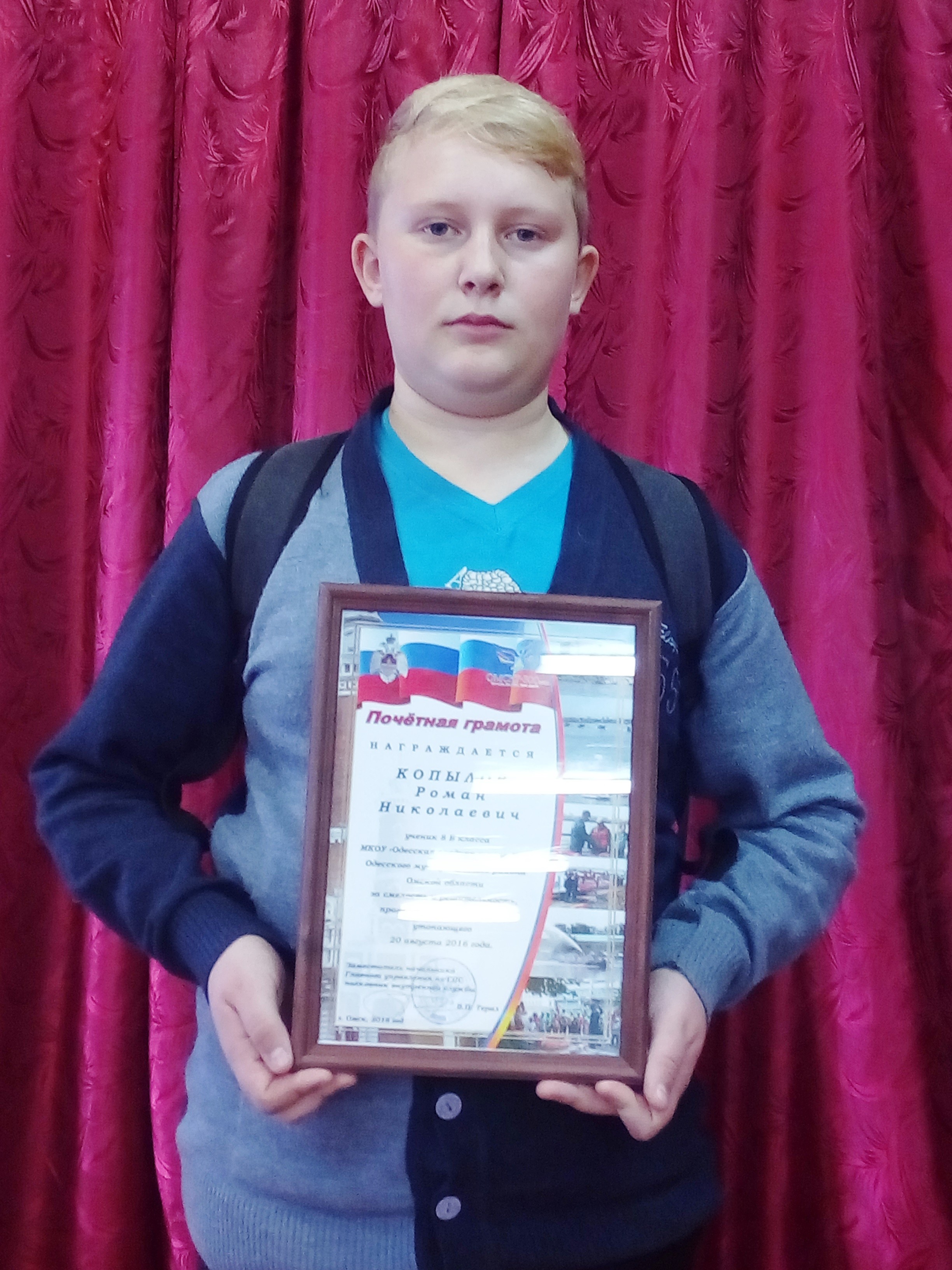 На линейке в Одесской школе № 2 ученик 7б класса Роман Копылов был награжден почетной грамотой Главного управления МЧС России по Омской области «За самоотверженность».