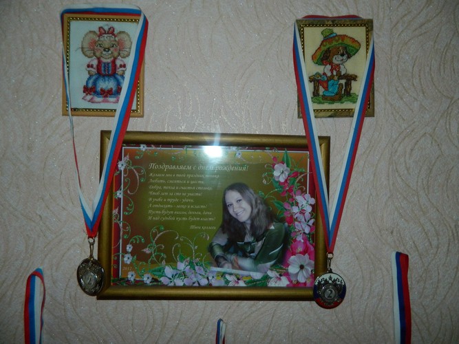 Мы разговариваем с Танюшей в ее уютной комнате, где немало места занимают детские игрушки. Она бережно хранит их все, даже самые старые. Здесь же ее множество медалей за победы в спортивных состязаниях областного уровня. Вот уже четыре года, как девушка успешно выступает за честь района в Омске - в команде с людьми с ограниченными возможностями - в таких видах спорта, как армрестлинг, метание ядра, пауэрлифтинг. На одной из стен - яркий диск дартса и точно попавшие в мишень дротики.