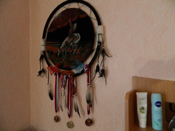 - Это тоже подарок. Картина называется "Ловец снов", - говорит Таня. - Раньше мне снились яркие, цветные сны, а сейчас почему-то их не вижу.