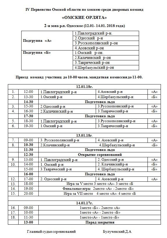 12 января в райцентре стартовали игры 2-го этапа зональных соревнований IV Первенства Омской области по хоккею среди дворовых команд «Омские орлята». Будут соревноваться команды из восьми районов региона Азовского, Калачинского, Омского, Павлоградского, Одесского, Таврического, Шербакульского, Русско-Полянского. Торжественное открытие турнира пройдёт на ледовом корте 13 января, в 12-30.