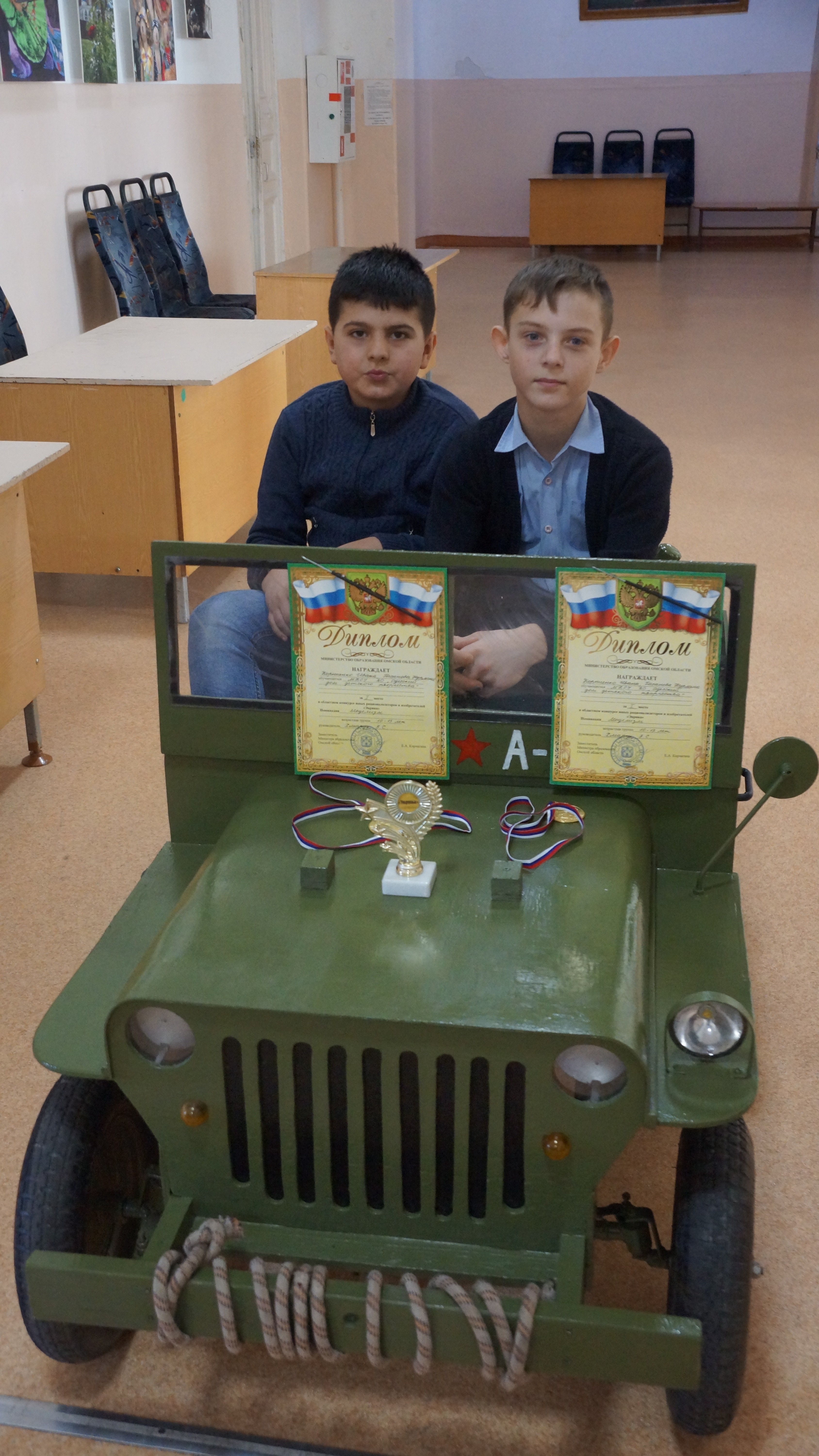 Под руководством педагога дополнительного образования Дома детского творчества Вячеслава Сергеевича Хмарука ребята изготовили автомодель джипа "Willys MB" на педальном ходу. Модель изготовлена к празднованию 74-ой годовщины Победы нашего народа в Великой Отечественной войне. Эту новость сообщила редакции педагог-организатор Ольна Васильевна Волкова.