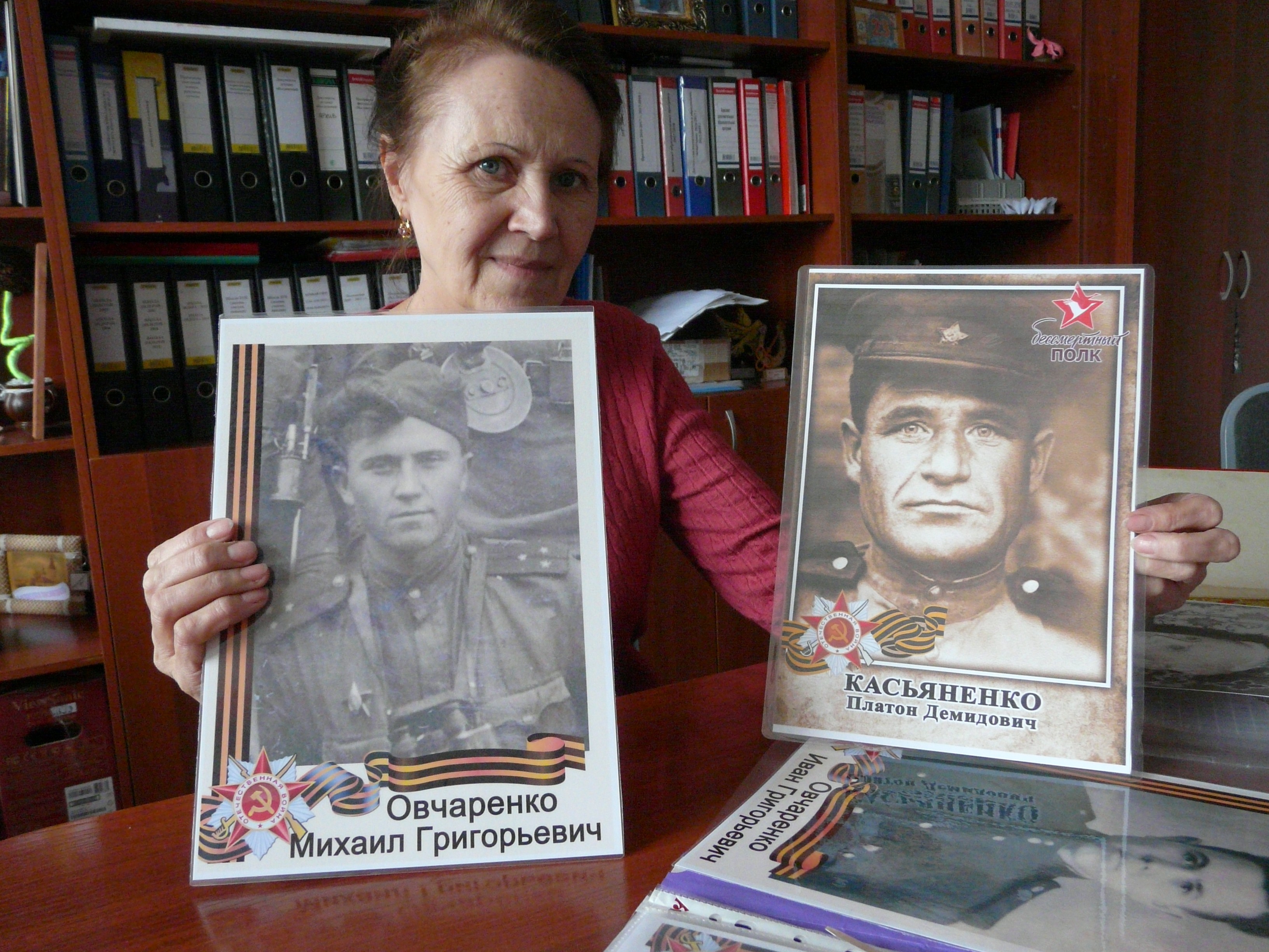 –Я принесла информацию о своём отце - Овчаренко Иване Григорьевиче, дедушке - Овчаренко Григории Севостьяновиче, дяде – Овчаренко Михаиле Григорьевиче и свёкре - Касьяненко Платоне Демидовиче. «Бессмертный полк» очень нужное и важное мероприятие. Ведь когда мы собираем информацию о своих родных и близких, в первую очередь вспоминаем человека, которого нет сейчас рядом. Благодаря акции мы с семьёй буквально воскресили без вести пропавшего дядю - Михаила Григорьевича Овчаренко. Оказалась, что он был командиром разведывательной роты. Сам он жил в Благодаровке, в 1941 году призван в армию. Прошёл краткосрочные офицерские курсы. Во время боевых действий был удостоен наград. Погиб в 1943 году, совсем молодым парнем. Мой свёкор - Платон Демидович, получил медаль "За отвагу". Во времена войны он служил шофёром, возил снаряды. В одном из столкновений с врагами наши солдаты одержали победу благодаря вовремя доставленному грузу. Боюсь представить, через что ему пришлось пройти. Во времена войны под прицелом врагов всегда были гружёные машины с боеприпасами. Мой дедушка – Григорий Севастьянович - во время войны попал в плен. Целый год он находился под гнётом фашистов, пока его не освободили наши солдаты. После ему пришлось доказывать свою преданность родине. Он попал в штрафной отряд, где за любое подозрение в неверности расстреливали. Половину своей жизни он служил родине, призван был ещё в годы революции. Он был очень дисциплинированным и отважным человеком. Мой отец Иван Григорьевич так же, как и дед, был шофёром. После окончания войны отец ещё семь лет оберегал нашу родину и служил отчизне. Каждый раз, когда вспоминаю о них, чувства и эмоции зашкаливают. Я благодарна всем ветеранам за мирное небо над головой. Дай вам бог здоровья, огромное спасибо!