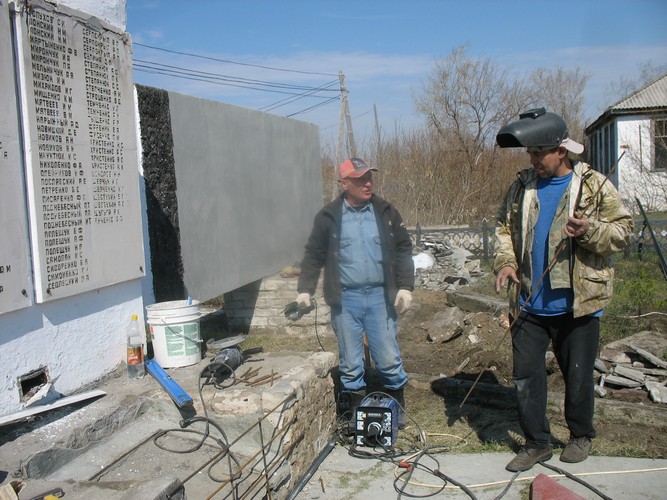 Двое мужчин из городского частного предприятия возятся у центральной тумбы. Один из них, Антон Сергеевич Бархударов, сваривает сетку из арматуры, на которую будет крепиться мраморная плитка. Второй рабочий, Сергей Николаевич Кузнецов, рассказывает: