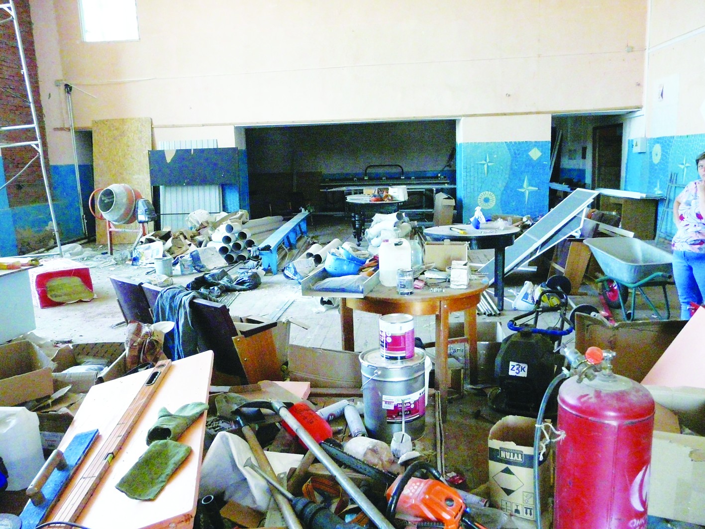 Экскурсию по зданию и окрестностям провела заведующая Елена Шефер. Радости на её лице пока не видно, только усталость от переживаний. Все дни, пока в Центре культуры и досуга идёт ремонт, она находится здесь почти неотлучно: бдительно следит, чтобы работы выполнялись качественно, а строители не нарушали дисциплину.