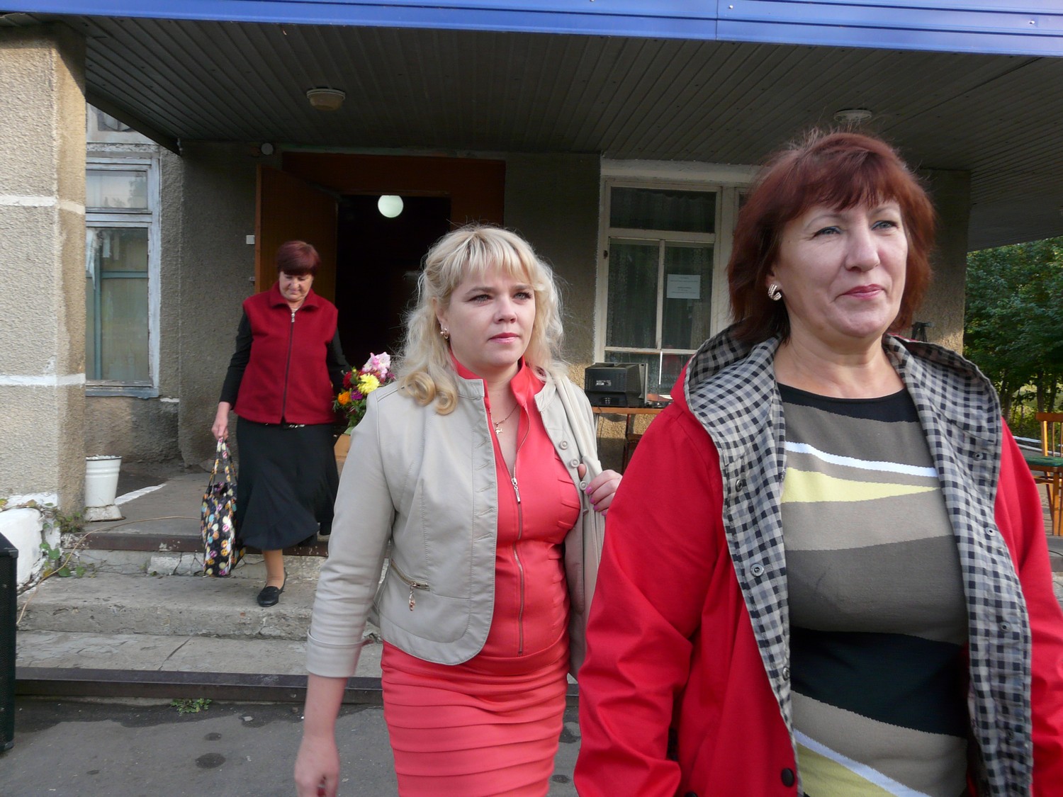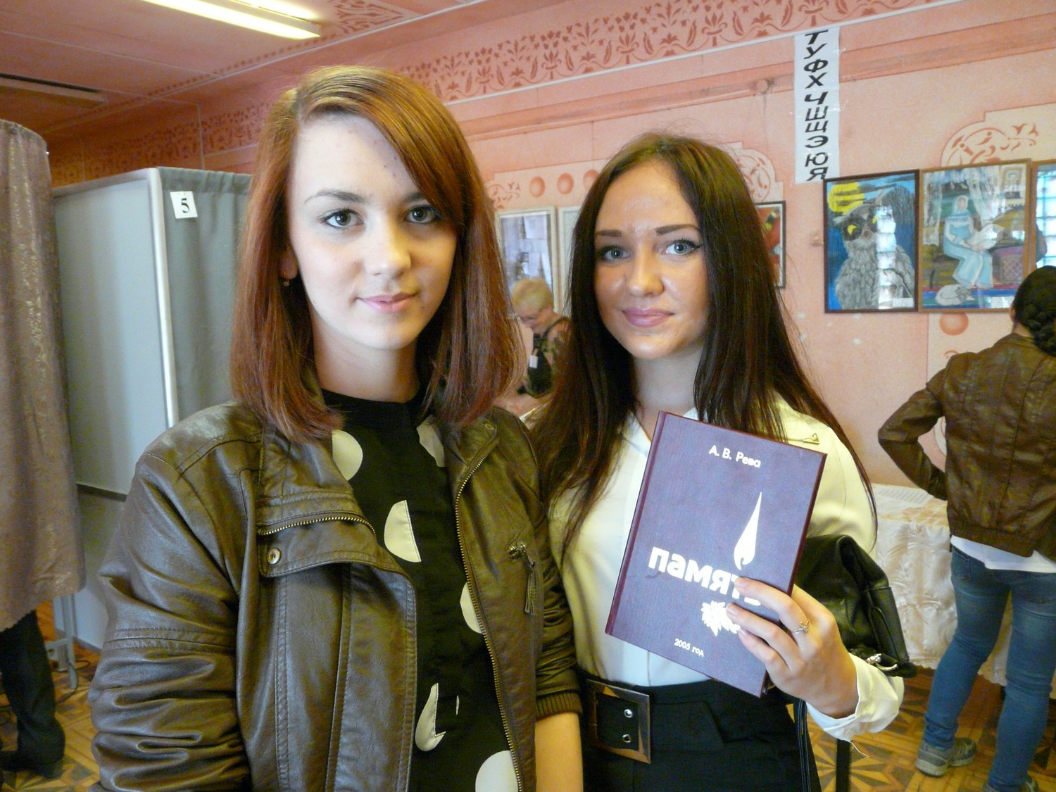 12.45. Одесское. Участок 1266. Пора и мне проголосовать. Как раз наплыв избирателей. Много молодежи. Некоторые пришли в первый раз. Останавливаю студенток института сервиса Сашу Ушакову и Марину Макаревич. Председатель комиссии Г.А. Клименко вручает им сувениры.