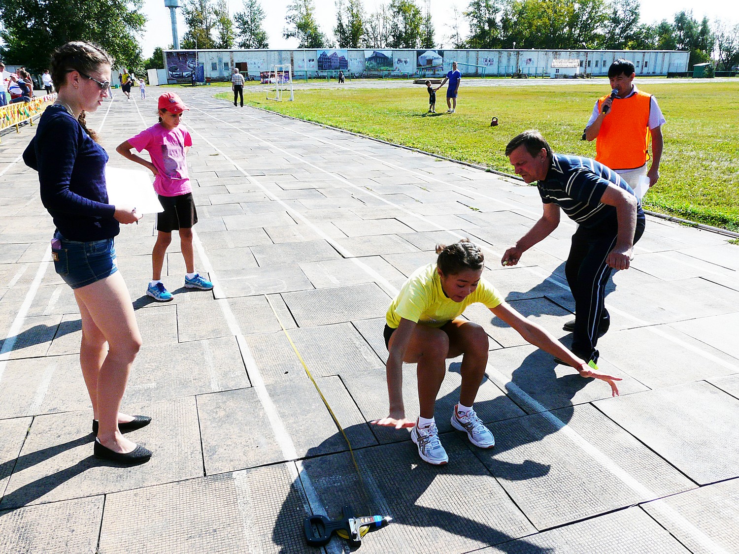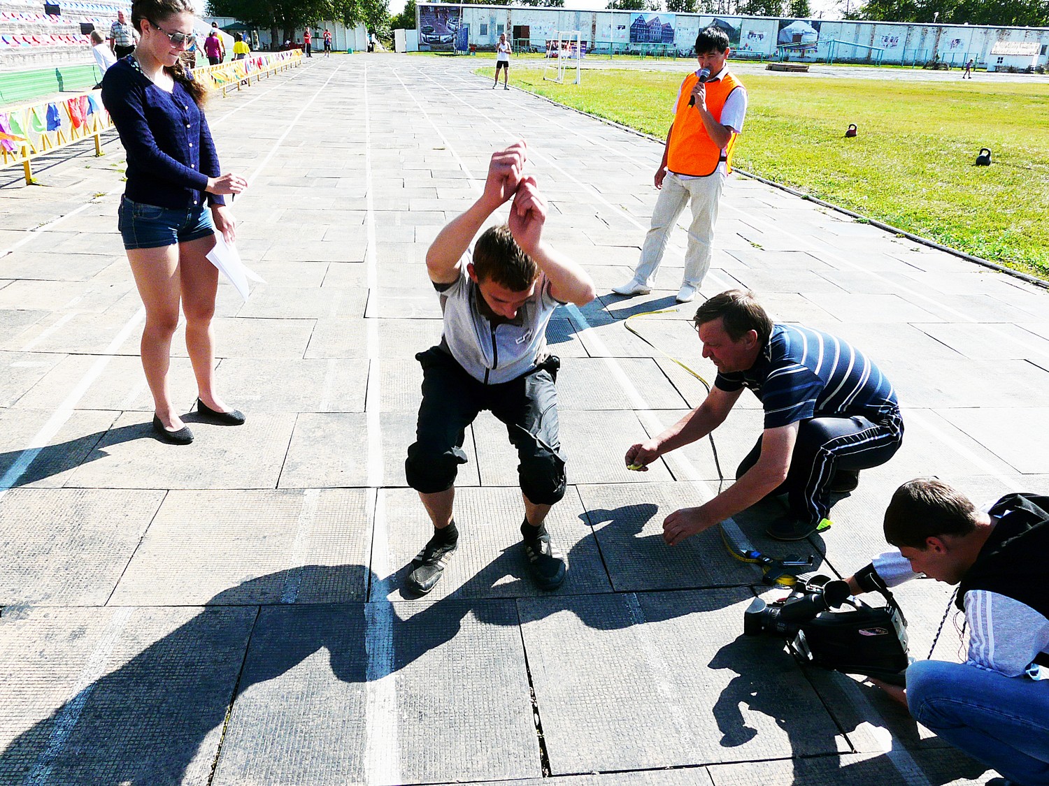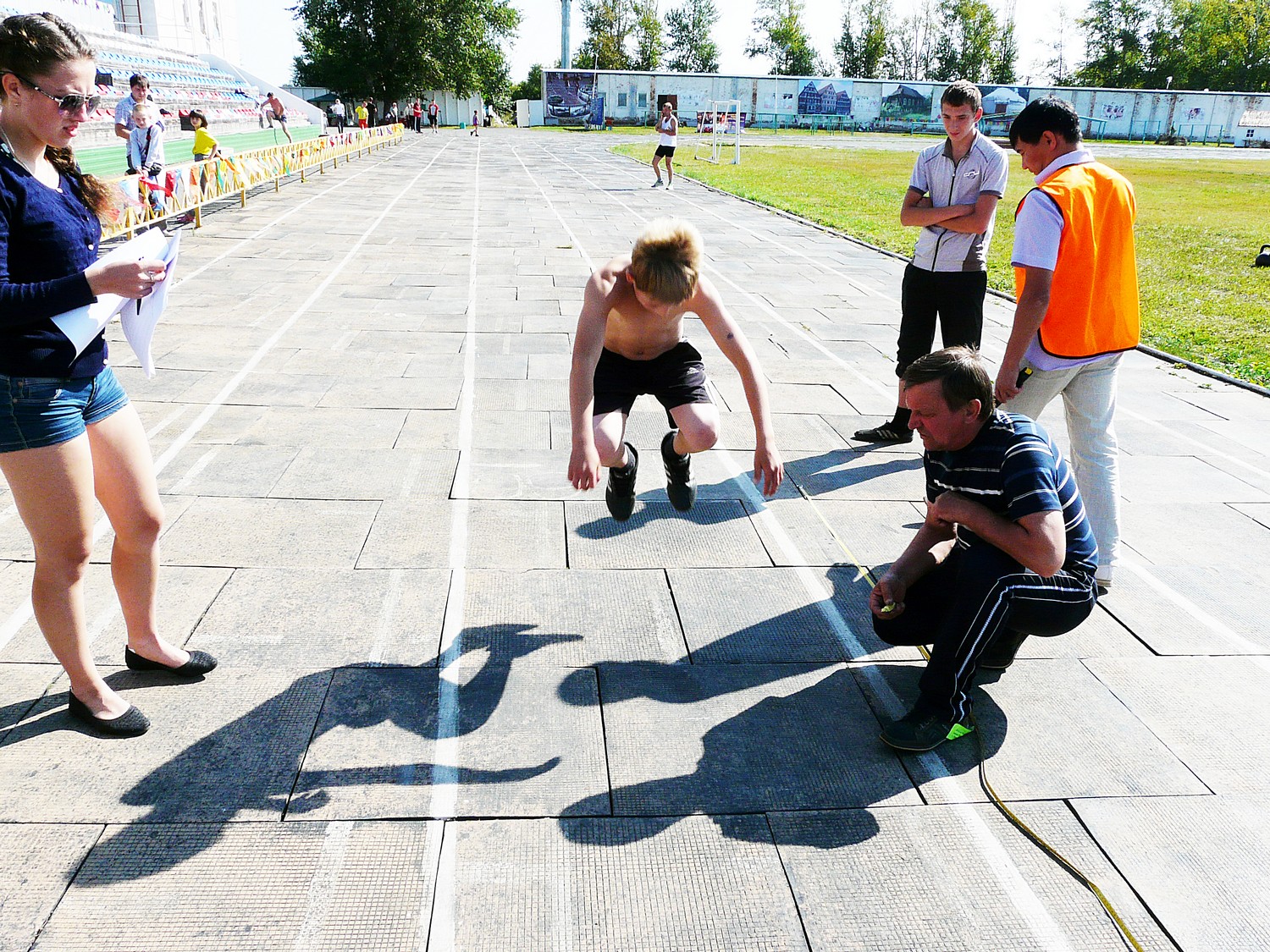 Чтобы сдать нормы на золотой, серебряный или бронзовый значек сегодня нужно было прыгнуть с места, отжаться от пола (женщинам) подтянутся на турнике (мужчинам) и пробежать 100 метров.