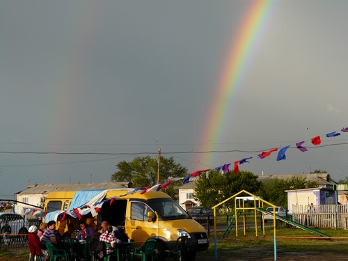 Все утро по небу ходили грозовые тучи, и с небольшими перерывами лил дождь. Поэтому на торжественную часть пришло немного народу. Но перед началом митинга в честь открытия памятных знаков нашим землякам Мулю Г.Г. и Новоселову А.М. наступил просвет, выглянуло солнце и, как добрый знак, над селом засияла радуга.