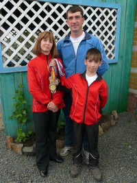 Сынишка Игорь в этом году начал выступать в полиатлоне, зимой и летом выиграл у ребят своего возраста. Вместе с родителями защищал честь Одесского района на областных соревнованиях. Там им всем вместе пришлось участвовать в соревнованиях по дартсу, бегать эстафету, где папа бежал 200 метров, мама -140, а ребенок - 60 метров, и играть в теннис.