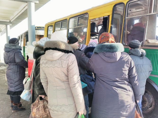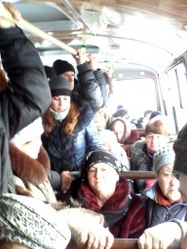 Отправляюсь на Одесский автовокзал. Автобус на Брезицк уже стоит, идет посадка пассажиров, часть уже внутри, снаружи еще человек 20. Начинаю фотографировать, люди подходят и говорят: «Фотографируйте-фотографируйте, как мы в этот автобус утрамбовываемся. Хотя сегодня народу не так и много, по сравнению с другими днями». В итоге в автобус входит около 40 человек, но стоят люди вполне свободно.