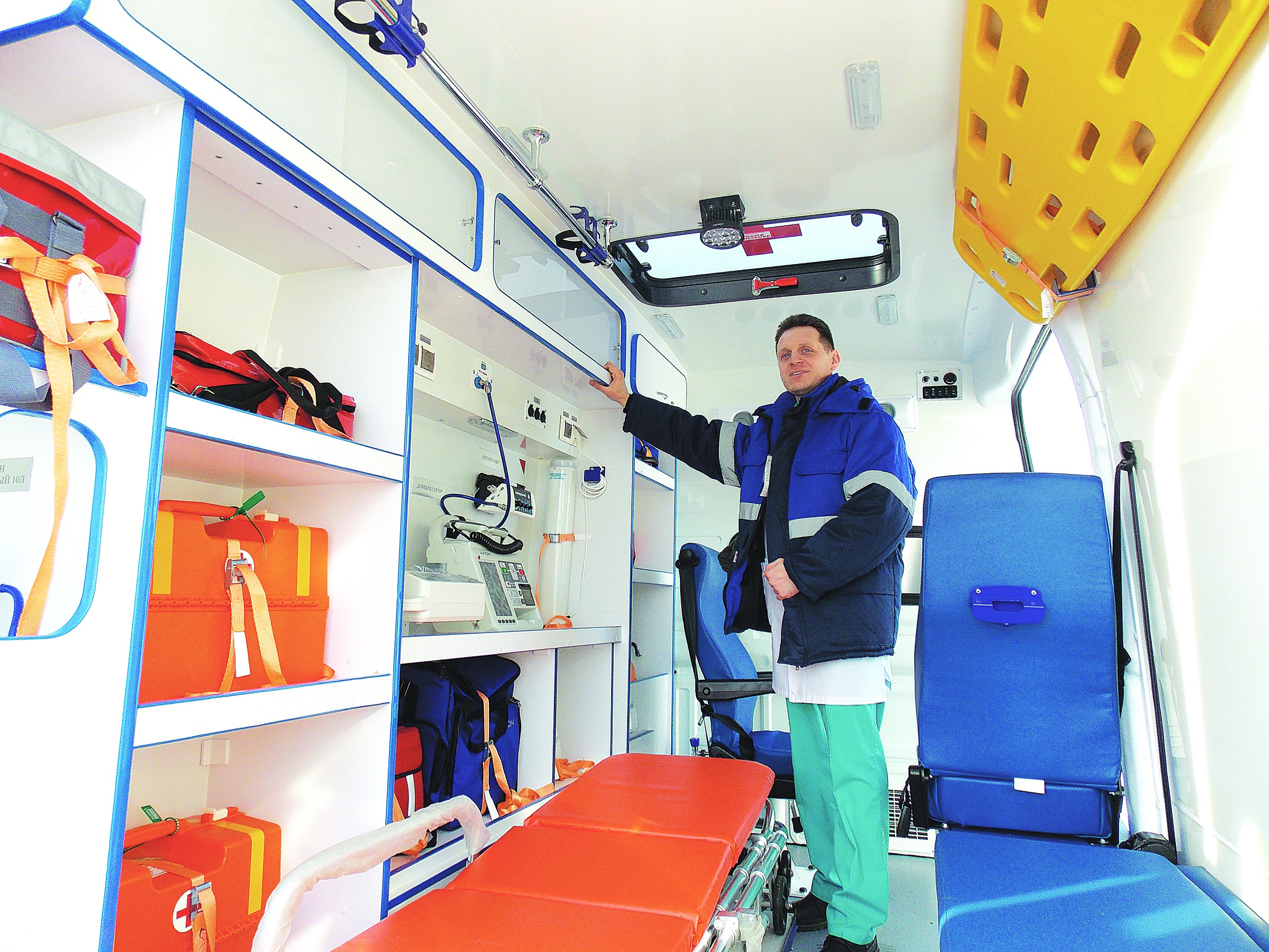 - Посмотрите, в ней свободно можно стоять в полный рост, - Сергей Гуртовенко с улыбкой показывает салон новинки. – А какое здесь оснащение! Кондиционер, автономное устройство обогрева, система обеззараживания воздуха, разнообразные носилки, каталки. Медоборудование всё необходимое есть - аппарат искусственной вентиляции лёгких, электродефибриллятор, электрокардиограф, глюкометр, аппарат для проведения ингаляционного наркоза, дозатор для точного введения препаратов (можно прямо в дороге вводить лекарства), самые разнообразные наборы для оказания помощи. Это «скорая» нового поколения по сравнению с нашими остальными машинами.