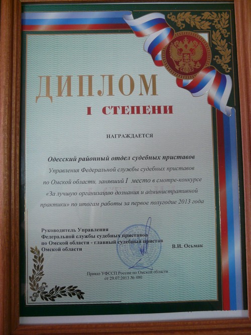 Одесский отдел судебных приставов по итогам первого полугодия занял первое место в областном смотре-конкурсе "За лучшую организацию дознания и административной практики"