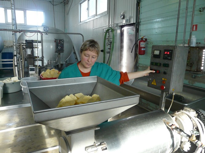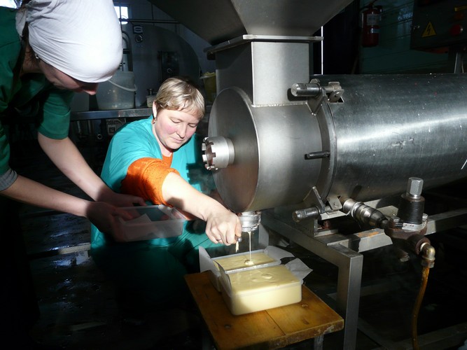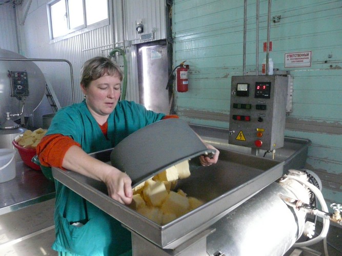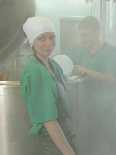 - Ну, что, начнем? - Олеся взяла два маленьких ведерка с водой и направилась к сыроплавильному котлу. Ей предстоит сделать две варки - готовой продукции получится примерно 91-92 кг.