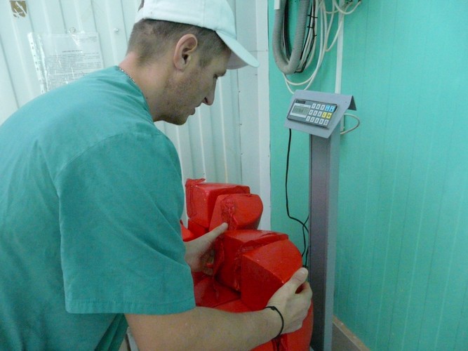 - Так мы нарежем как вам нужно... Конечно, тут нужен мощный шприц, у нас он есть, - продолжает директор, - если его присоединить, он протянется через весь цех, пройти нельзя будет, поэтому мы и делаем так. При использовании шприца мы могли бы фасовать в стаканчики и чапы (такие небольшие колбасочки), но при малых партиях использовать шприц невыгодно, вся плавка останется в шланге.