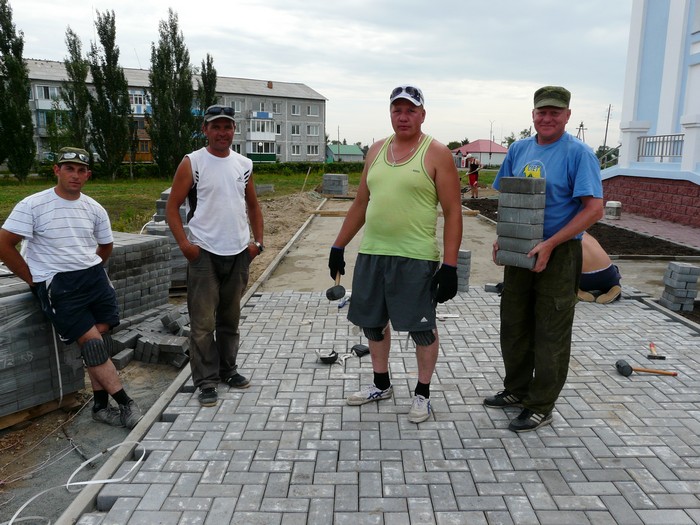 Четыре человека из бригады ИП В.А. Демченко: М.О. Обухов, В.В. Неживой, А.В. Холоденко, Т.В. Гейнце, тщательно подготовив подушку, укладывают на нее плитку, а студент Аграрного университета Роман Сиденьков и студент ОмГУ Александр Красный - с помощью бетономешалки готовят раствор. Все они стараются быстро и качественно выполнить работы у этого необычного объекта.
