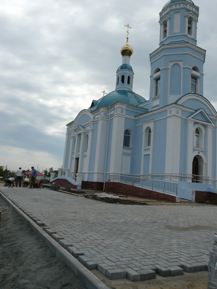 Территория у нового храма в Одесском преображается на глазах, одеваясь в серую плитку, отороченную аккуратным бордюром. Она уложена уже на 2/3 площади, а всего займет где-то 1100 квадратных метра.