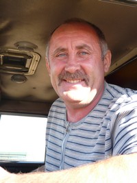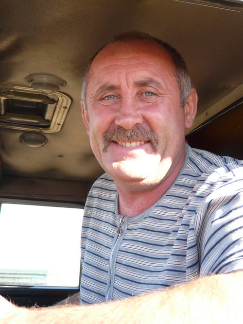 Пока разговаривали, появился юркий, без прицепа "ЗИЛ" - и прямиком в поле, к комбайнам. В.К. Ходор говорит, что скоро добавятся для транспортировки зерна с поля на ток трактора "МТЗ" с телегами. А пока один "КамАЗ" стоит на дороге со снятым с прицепа колесом, и хозяина рядом не видно, а вот второй "КамАЗ" готов в любой момент двинуться к комбайну, первому подавшему знак о полном бункере. Едва я успеваю подбежать к этому автомобилю, за рулем которого сидит водитель-профессионал, известный в районе передовик Сергей Дмитриевич Погребняк, как
