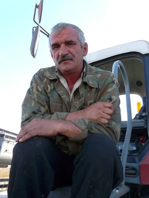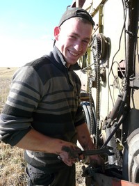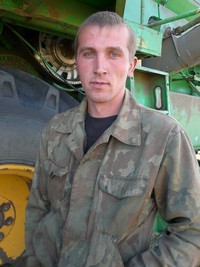 Направляемся к остановившемуся "Дону 1500". 26 лет Сергею Владимировичу Кривошее, и шесть из них он отдал хлеборобскому делу. Профессию получил в ПУ-18, а прошлой зимой повысил классность - теперь он механизатор первого класса! Жена, дочки Сашенька и Алиночка каждый день ждут Сергея с поля домой. А он старается в уборку побольше заработать для своего семейства.