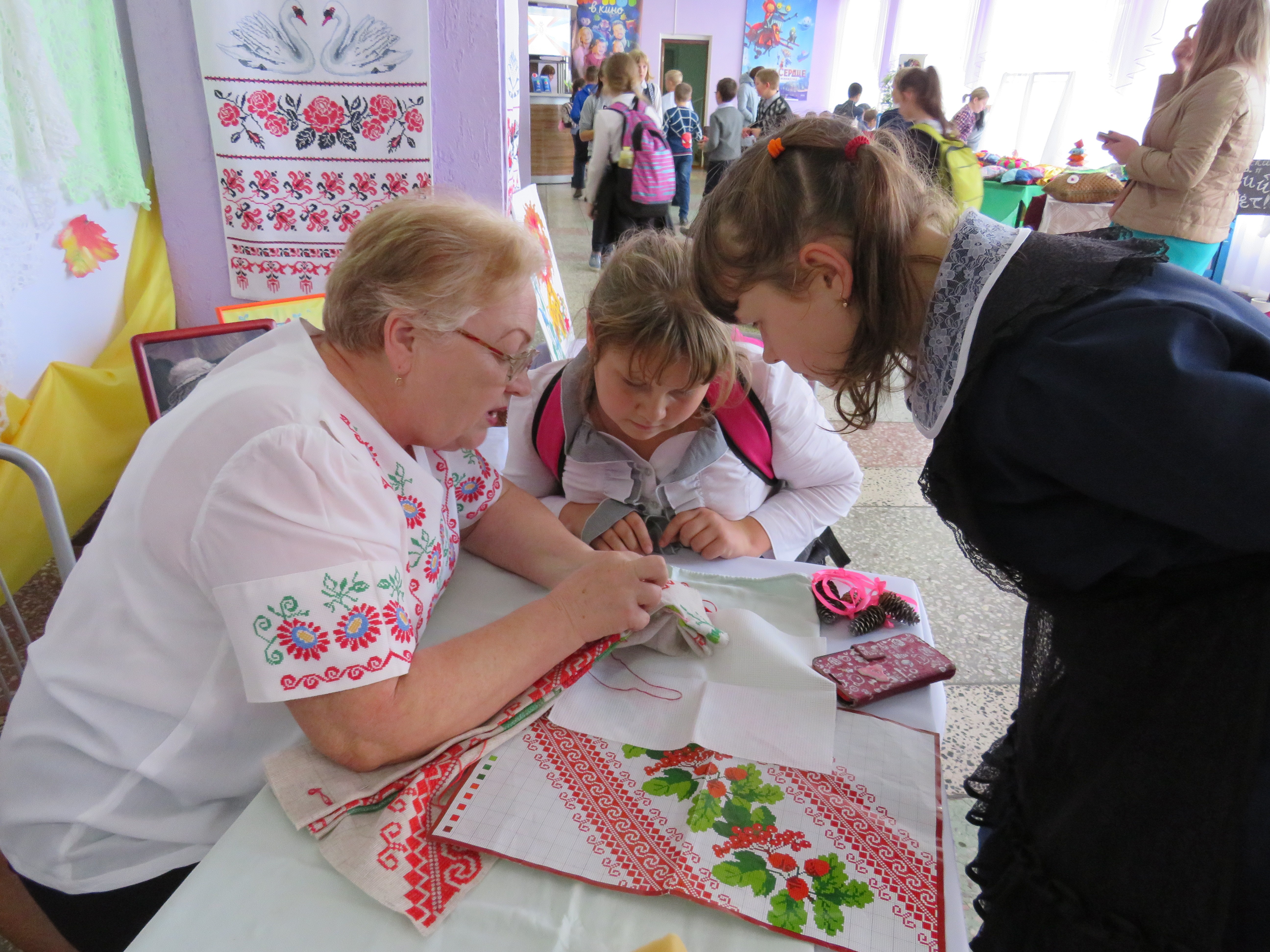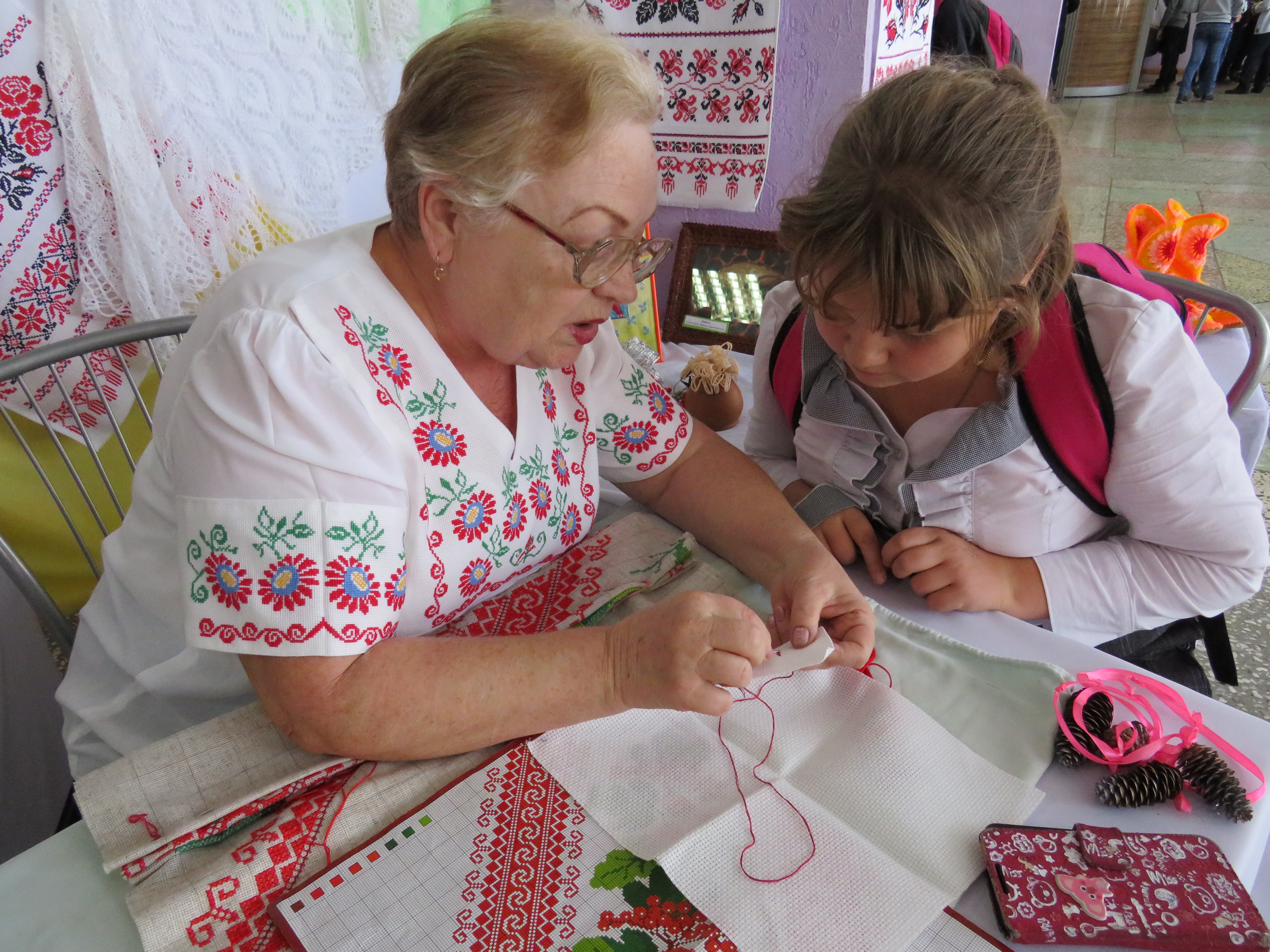 Выставку с таким названием организовали одесситы. Здесь можно было полюбоваться тончайшими вязаными шалями Татьяны Срибной, башмачками Оксаны Трубкиной, вышитыми картинами Ирины Селезнёвой и рушниками Доры Ситник. Дора Михайловна проводила мастер-класс по вышивке крестиком, за 20 минут научив пятиклассницу Полину Заровчатскую основам такого способа шитья (на фото).