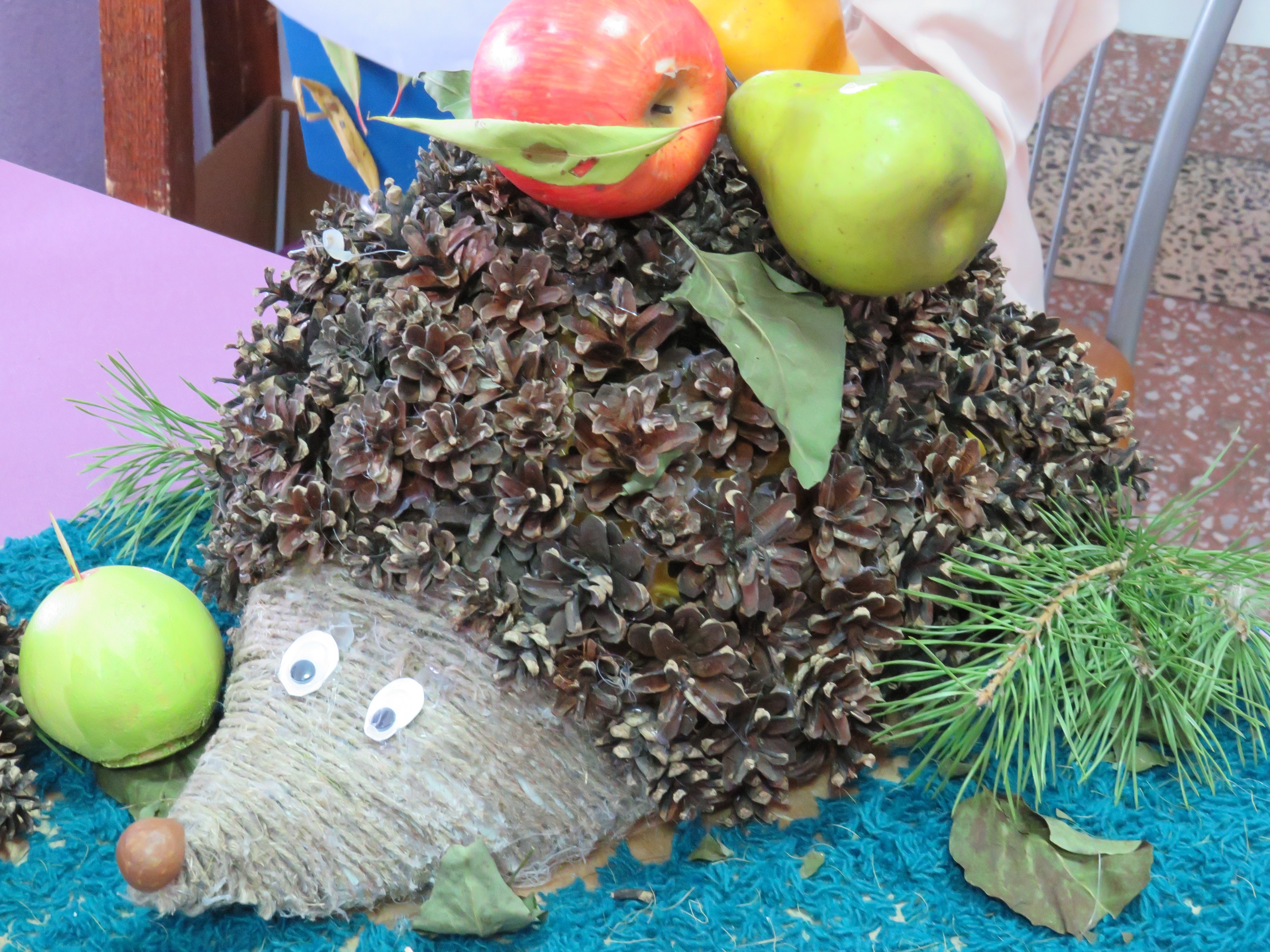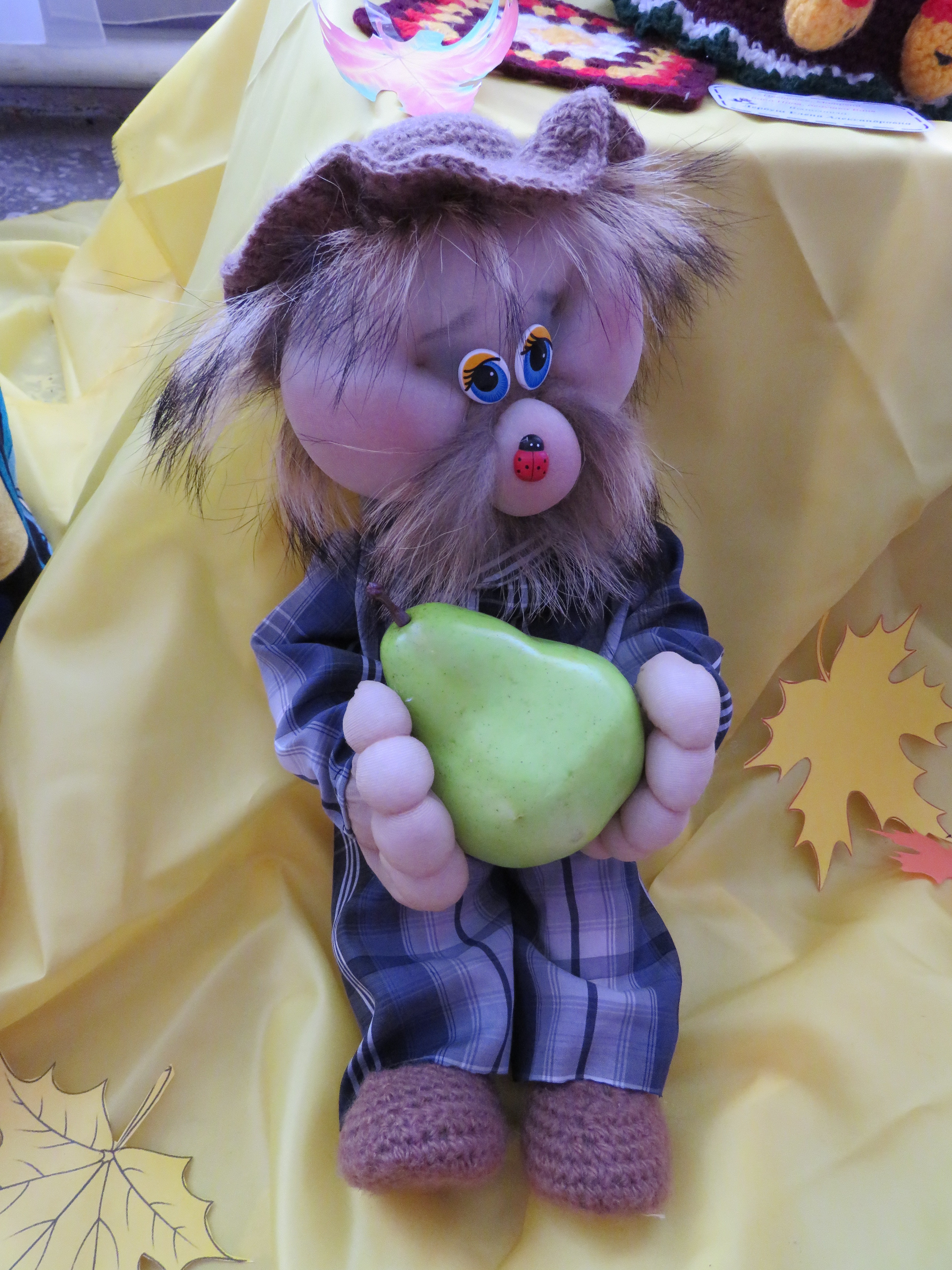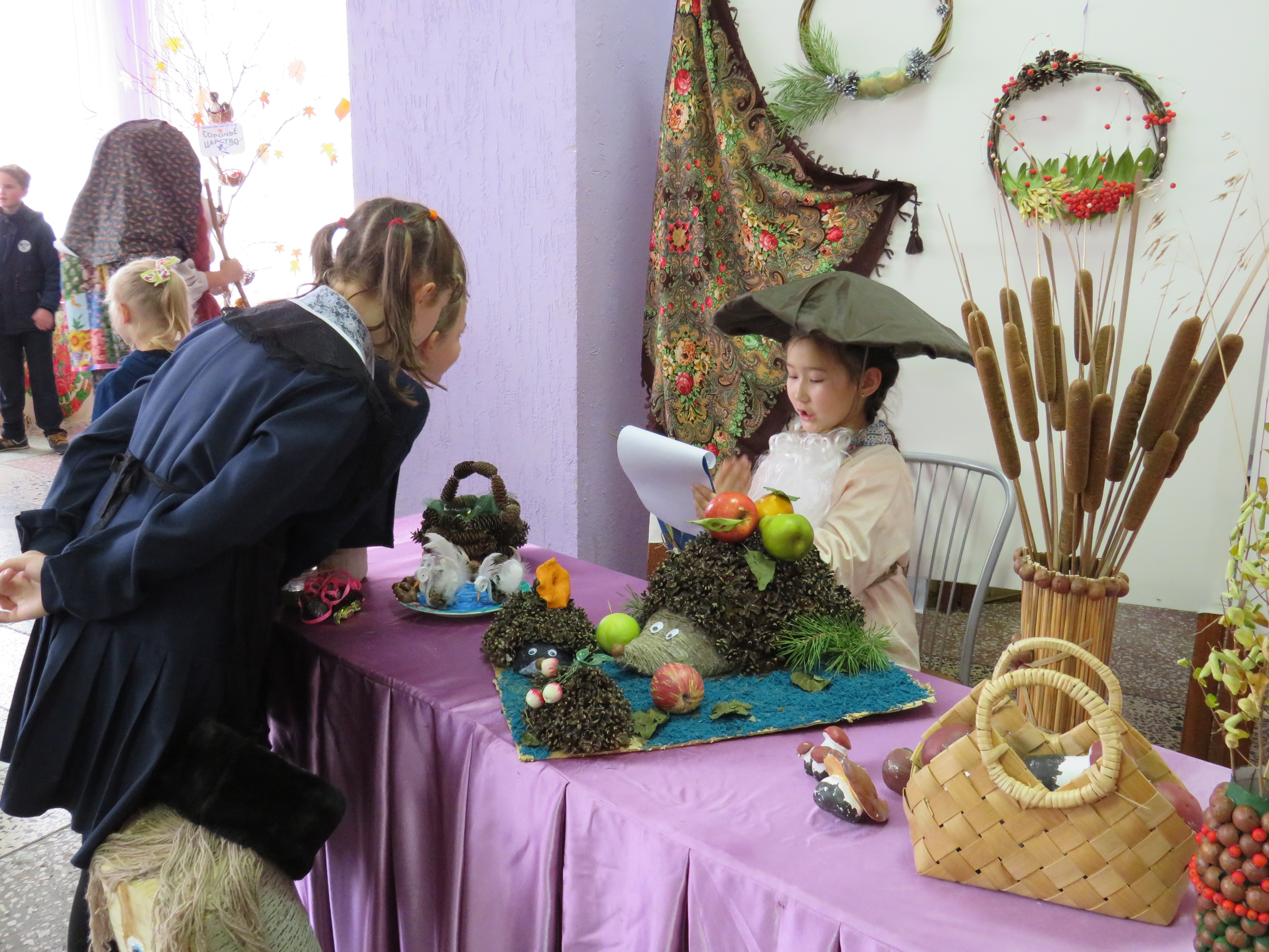 Поделками из даров леса – шишек, веточек, орехов, камыша - порадовали юные ганновцы, которые занимаются в кружке декоративно-прикладного творчества «Фантазия» под руководством Ярослава Викарчука. А воспитанница театрального кружка Дарина Бейсембаева в роли Старичка-Боровичка (на фото) загадывала всем загадки и угощала сладостями.