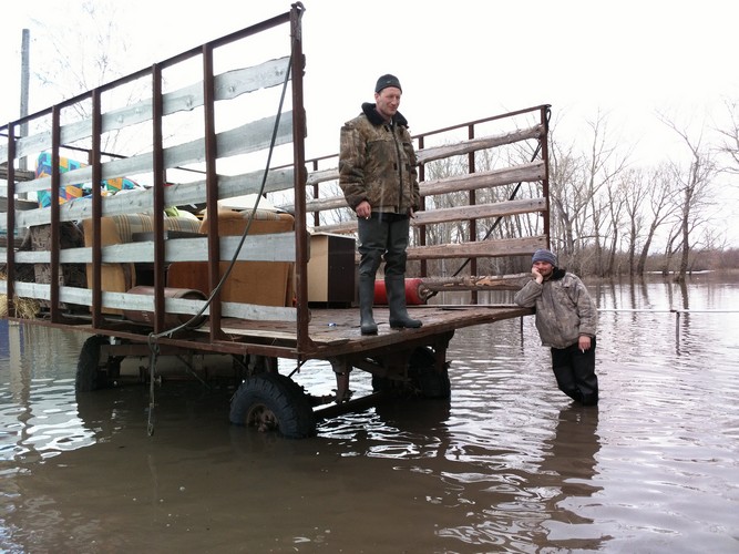 - Еле успели скот к тёще перевести, вчера в доме вода начала подниматься, - рассказывают Нина Николаевна и Анатолий Викторович. – Пока совсем не залило, решили переехать к дочери в Желанное. Вот, дали нам трактор с телегой. Судя по всему, надолго уезжаем. В доме уже стены подмывает, вся улица залита, невозможно жить.