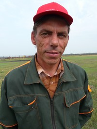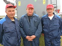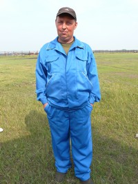 Все десять механизаторов у этих комбайнов - выходцы из колхоза "Комсомольский" в новеньких спецовках, причем в каждом КФХ она разного цвета. КФХ "Петровское" представляют четыре механизатора, в их числе Сергей Иванович Лебедев.