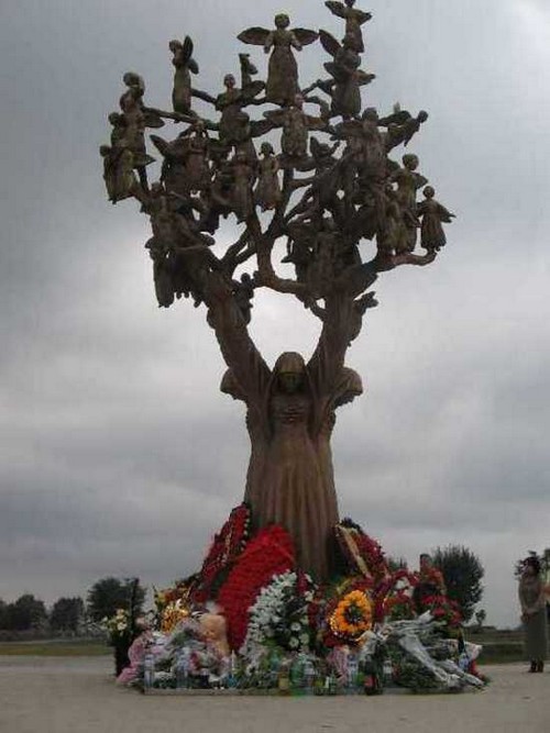 На фото вы видите памятник "Древо скорби" на мемориальном кладбище "Город Ангелов", где похоронены жертвы теракта в Беслане. Памятник представляет собой четырех держащихся за руки матерей, над которыми, как птицы, летят в небо души погибших детей. Под этим памятником похоронены фрагменты тел детей. Всех, кого не опознали, похоронили здесь. И каждое утро матери, потерявшие детей своих, снова приходят сюда. Ищут лица малышей своих в ветвях "Древа скорби". И находят. И говорят с ними…