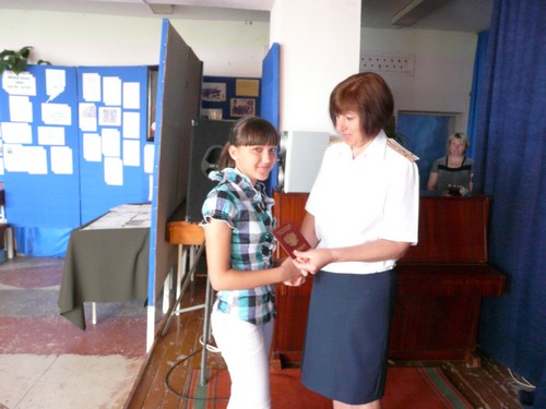 По традиции, ежегодно к Дню России, шкльникам достигшим 14-ти лет торжественно вручают удостоверения личности. В этот день паспорта получили девять граждан России это: Татьяна Пинтюк (Буняковка), Юлия Ковинская (Буняковка), Владислав Шульга (Желанное), Владислав Айвазян (Одесское), Сергей Хмарук (Одесское), Денис Девкин (Одесское), Таня Журавлева (Одесское), Шавыкина Анастасия (Брезицк), Марат Рахматулин (Песчанка). С напутственным словом обратилась к ребятам начальник паспортно-визовой службы в Одесском районе, Галина Николаевна Змеевская, в котором пожелала ребятам счастливого пути в новую жизнь с первым в жизни паспортом.