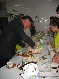 Он пришел не с пустыми руками, впрочем, как и другие гости. Предприниматель Е.В. Шнайдер пообещал детям социально-реабилитационного центра поездку в кинотеатр города Омска, а большой торт вручила Светлана Земляная и передала обещание от аграрного комитета партии установить на здании приюта спутниковую антенну.