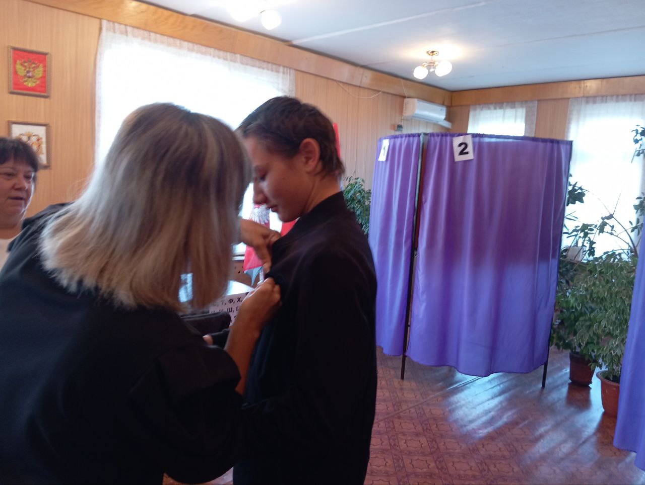 Председатель участковой избирательной комиссии Марина Александровна Новосёлова вручила юноше денежный сертификат, значок и Конституцию Российской Федерации.