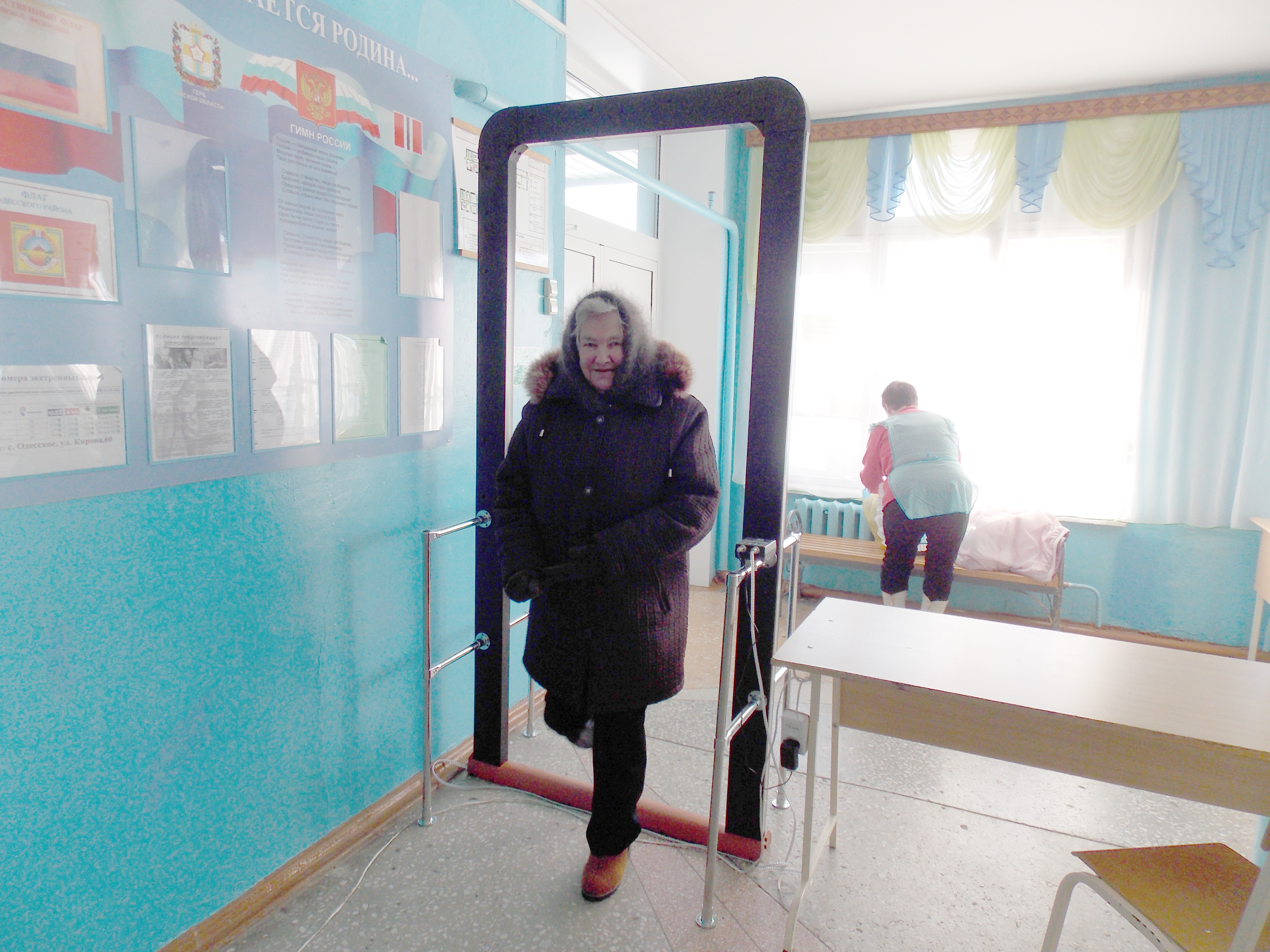 А теперь можно совместить приятное с полезным: поработать на участке №1285 и одновременно проголосовать. Вход в Одесскую школу №1 выглядит немного устрашающе - здесь стоит рамка для сканирования вещей, при перешагивании через которую раздаётся тревожный звонок. Эта школа является базовой для сдачи ЕГЭ, оборудование