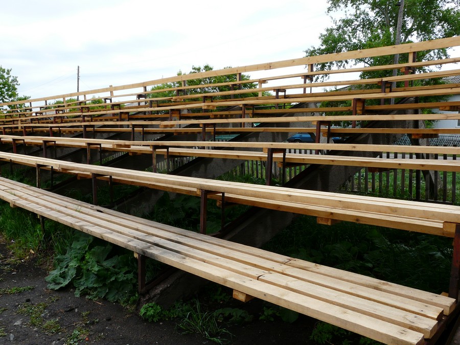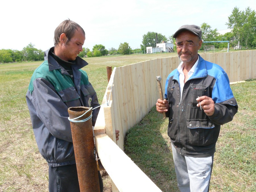 хоккейная коробка и зрительские трибуны на стадионе, что раскинулся возле школы. Сразу после обеда последние два пролета на коробке забивали двое работников с биржи, которые трудятся здесь с 19 мая. Контроль ведут специалист по работе с молодежью Ореховского поселения В.В. Юрукин и учитель физкультуры в школе Ю.В. Ласьков.