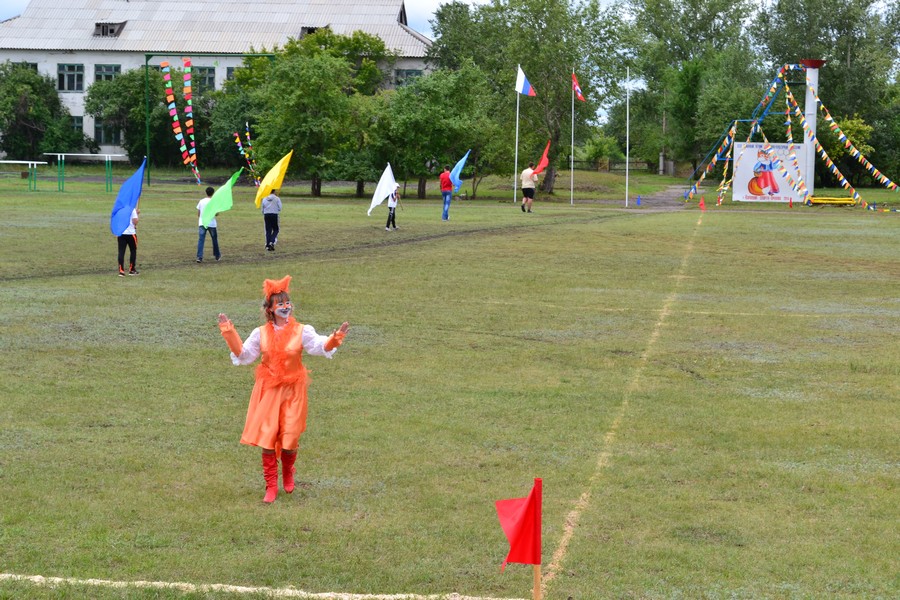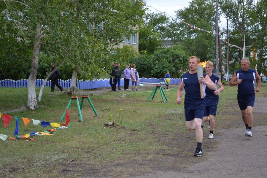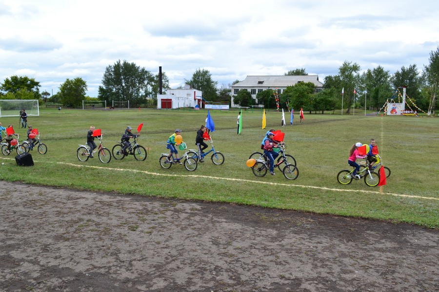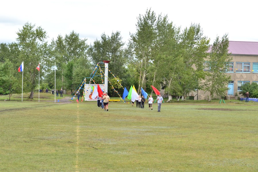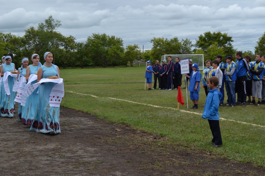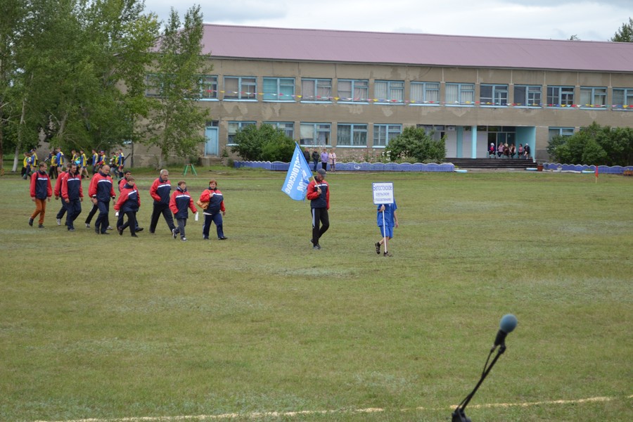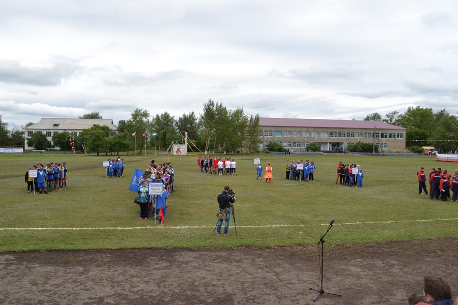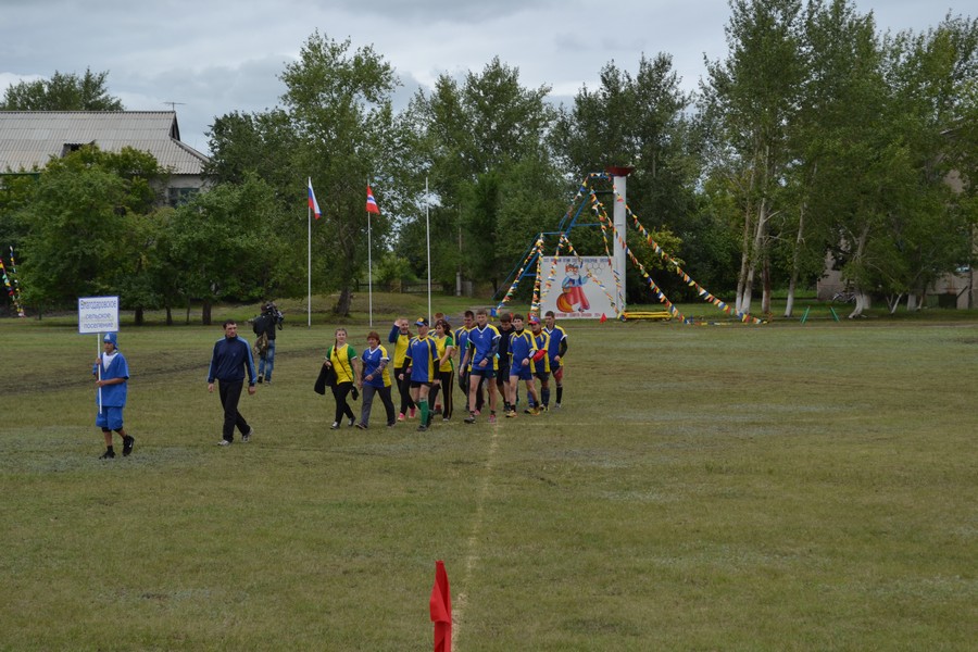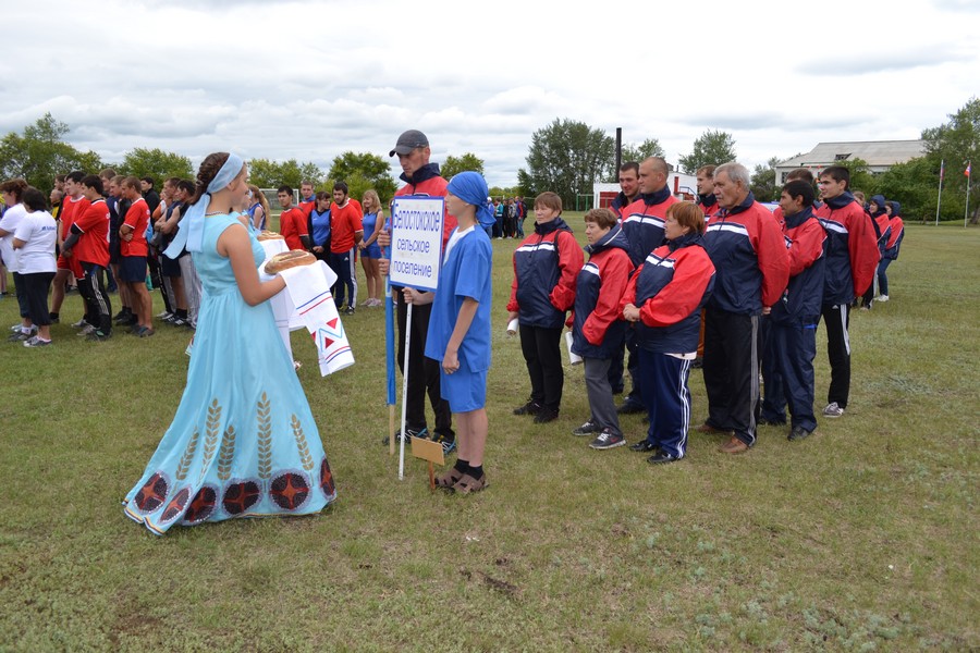 Праздничное шествие начали 12 юношей. Учащиеся местной школы, шли с флагами выстраиваясь в разные фигуры. За ними с разноцветными шариками ехали будущие мастера велоспорта - дети. Они дали круг почета по стадиону. Потом, как горох, на стадион высыпали гимнасты. 35 детей и подростков показывали на поле различные упражнения с обручами и мячами. Откуда-то незаметно появилась Лиса (Ксения Циглер), символ спартакиады и начался парад команд. Флаг спартакиады несли Виталий Кравец, Игорь Камлатов, Ирина Камлатова, Дарья Латышева. После торжественных речей руководителей района десять девушек в красивых нарядах вручили спортсменам хлебные караваи.